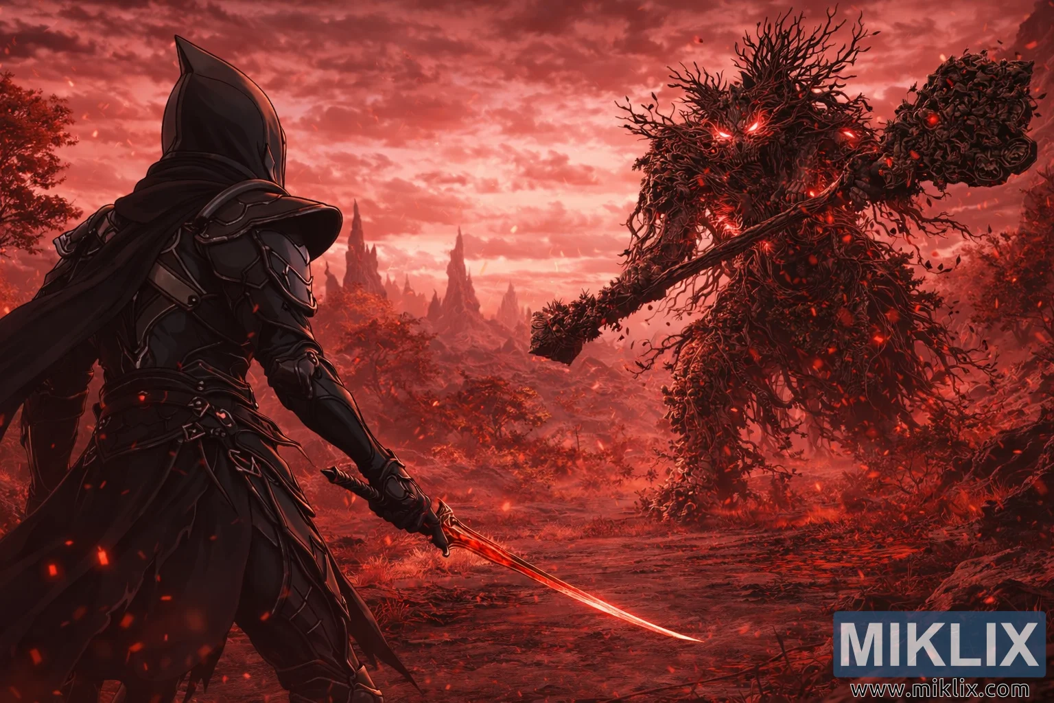 એનાઇમ-શૈલીની ચાહક કલા યુદ્ધ ફાટી નીકળ્યા પહેલા, કેલિડના ભ્રષ્ટ પ્રદેશમાં એક નાટકીય, વિશાળ ખૂણાનું દૃશ્ય રજૂ કરે છે. ફ્રેમ કિરમજી અને અંગારાના દમનકારી રંગોમાં ડૂબી ગઈ છે, જાણે કે દુનિયા પોતે જ ધૂંધળી રહી હોય. આકાશ લાલ વાદળોથી ભારે છે જે હળવાશથી ચમકે છે, જ્યારે રાખ જેવા તણખા દ્રશ્ય પર ફરે છે, જે કાયમ માટે દહનની અણી પર રહેલી ભૂમિની છાપ આપે છે. રચનાની ડાબી બાજુએ કલંકિત ઉભો છે, જે પાછળથી આંશિક રીતે દેખાય છે અને સહેજ પ્રોફાઇલમાં છે, જે દર્શકને યોદ્ધાની સ્થિતિમાં મૂકે છે. કલંકિત આકર્ષક કાળા છરીનું બખ્તર પહેરે છે, તેની શ્યામ, શિલ્પવાળી પ્લેટો સળગતા વાતાવરણના સૂક્ષ્મ હાઇલાઇટ્સને પ્રતિબિંબિત કરે છે. એક હૂડ અને લાંબો, ફાટેલો ડગલો પાછળની તરફ, ગરમ, અદ્રશ્ય પવનમાં લહેરાતો. કલંકિતના જમણા હાથમાં એક વક્ર ખંજર છે, જે નીચું પકડેલું છે પરંતુ તૈયાર છે, તેનો છરી લાલ પ્રકાશની લહેર પકડી રહ્યો છે જે આસપાસના આકાશની ચમકને પ્રતિબિંબિત કરે છે. મુદ્રા તંગ છતાં સંયમિત છે, બેદરકાર આક્રમકતાને બદલે સાવધાની અને સંકલ્પ દર્શાવે છે. કલંકિતની સામે, ફ્રેમની જમણી બાજુ ભરેલી, સડો અવતાર દેખાય છે. આ પ્રાણી જીવંત પ્રાણી જેવું ઓછું અને સડોના ચાલતા સ્મારક જેવું વધુ દેખાય છે: તેનું વિશાળ શરીર ગૂંચવાયેલા મૂળ, ફાટેલી છાલ અને ભ્રષ્ટ લાકડાથી બનેલું છે જે એકસાથે એક વિશાળ માનવીય આકારમાં ભળી ગયું છે. તેના સ્વરૂપની તિરાડોની અંદર, પીગળેલા લાલ ઊર્જાના ધબકારા, તેની પોલી આંખો અને સડોની નસોને તેની છાતી અને હાથ પર પ્રકાશિત કરે છે. અવતાર મૂળ અને પથ્થરમાંથી ઉગાડવામાં આવેલ એક વિશાળ ક્લબને પકડી રાખે છે, જે તેના શરીર પર ત્રાંસા રીતે ઉછરે છે, જે નિકટવર્તી હિંસા સૂચવે છે. તેમની વચ્ચેની જમીન એક સળગેલી, તિરાડવાળી રસ્તો છે, જે પ્રતિબિંબિત લાલ અને છૂટાછવાયા અંગારાથી આછું ચમકે છે. આ માર્ગની આસપાસ વિકૃત ઘાસ અને હાડપિંજરના વૃક્ષો છે, તેમની કાળી ડાળીઓ લોહીના લાલ આકાશ તરફ પંજા મારતી હોય છે. દૂરની પૃષ્ઠભૂમિમાં, ખડકના તીક્ષ્ણ શિખરો ધુમ્મસમાંથી તૂટેલા ફેણની જેમ ઉગે છે, જે કેલિડના પ્રતિકૂળ, પરાયું સ્વભાવને વધારે છે. રચના ગતિ પહેલાં ચાર્જ થયેલ સ્થિરતા પર ભાર મૂકે છે: કોઈ પણ લડવૈયાએ હજુ સુધી હુમલો કર્યો નથી, પરંતુ તેમની વચ્ચેની જગ્યા વીજળીથી ભરેલી, અપેક્ષાથી જાડી લાગે છે. કલર પેલેટમાં ઘેરા લાલ અને કાળા રંગનું પ્રભુત્વ છે, જેમાં કલંકિતના બખ્તર પર સૂક્ષ્મ ધાતુના હાઇલાઇટ્સ અને અવતારના શરીરમાં જ્વલંત ઉચ્ચારણો છે, જે દ્રશ્યને ક્ષતિ, ભય અને અનિવાર્ય મુકાબલાના એક જ, દમનકારી વાતાવરણમાં એક કરે છે.