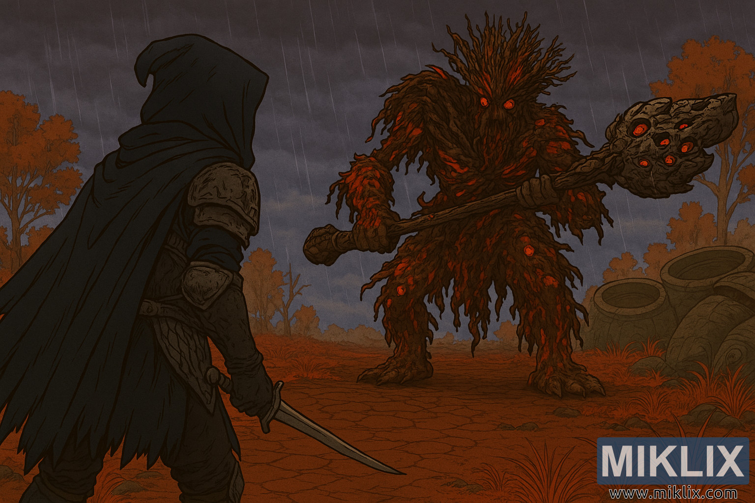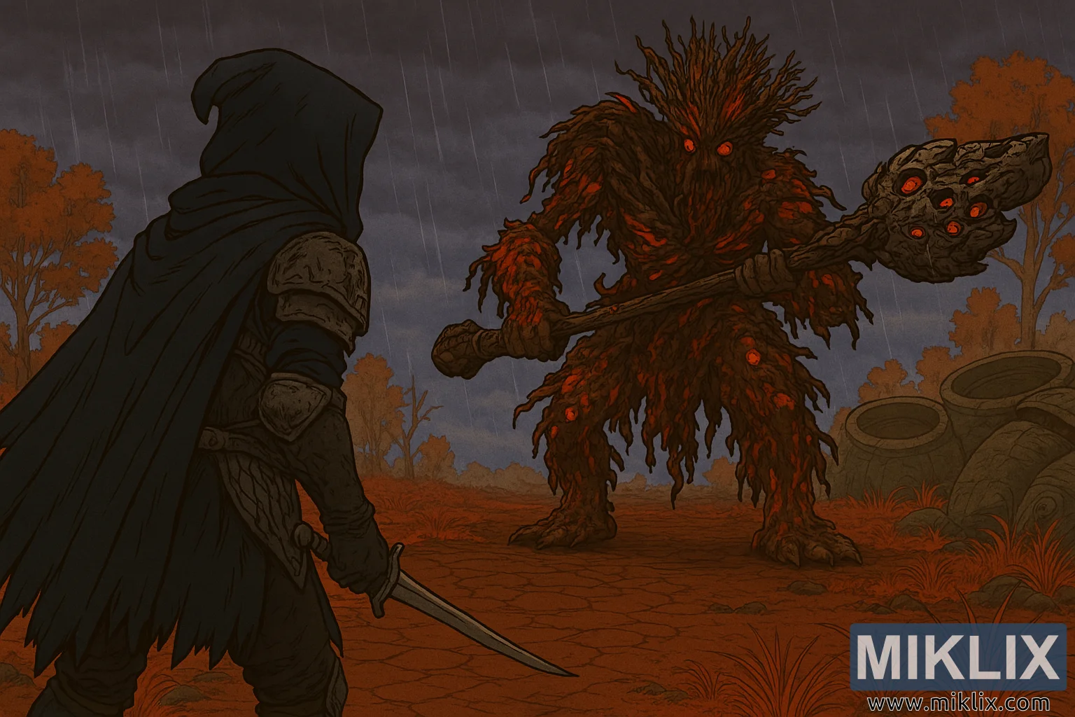 આ ચાહક કલા એલ્ડેન રિંગના કેલિડ પ્રદેશના ભૂતિયા સૌંદર્ય અને ક્રૂર વાતાવરણને શ્રદ્ધાંજલિ આપે છે, જે શૈલીયુક્ત સ્વભાવ સાથે કથાની તીવ્રતાનું મિશ્રણ કરે છે. તે ક્ષતિ, રહસ્ય અને કાલ્પનિકતામાં ડૂબેલી દુનિયામાં એકલા યોદ્ધાના ભય અને નિશ્ચયને ઉજાગર કરે છે જે એક જબરદસ્ત શત્રુનો સામનો કરી રહ્યો છે.