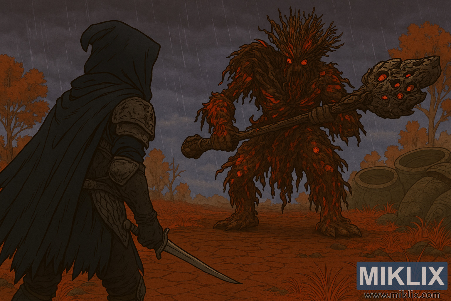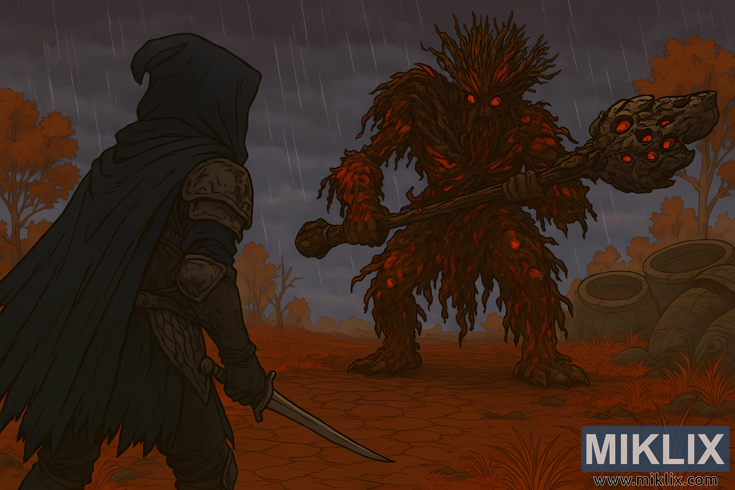 આ સ્થળ સ્પષ્ટપણે કેલિડ જેવું દેખાય છે, જે માટીના લાલ, ભૂરા અને રાખોડી રંગમાં રંગાયેલું છે. જમીન તિરાડ અને સૂકી છે, લાલ, સુકાઈ ગયેલા ઘાસના ટુકડા અને ફૂગના સડો સાથે. પાનખર રંગના છૂટાછવાયા પાંદડાવાળા વાંકડિયા, પાંદડા વગરના વૃક્ષો પૃષ્ઠભૂમિમાં ફેલાયેલા છે, અને મોટા, શેવાળથી ઢંકાયેલા પથ્થરના વાસણો પ્રાણીની જમણી બાજુએ અડધા દટાયેલા છે. આકાશ ઘેરો અને વાદળછાયું છે, ભારે વાદળો અને વરસાદની ત્રાંસી છટાઓ દ્રશ્યમાં ગતિ અને અંધકાર ઉમેરે છે.