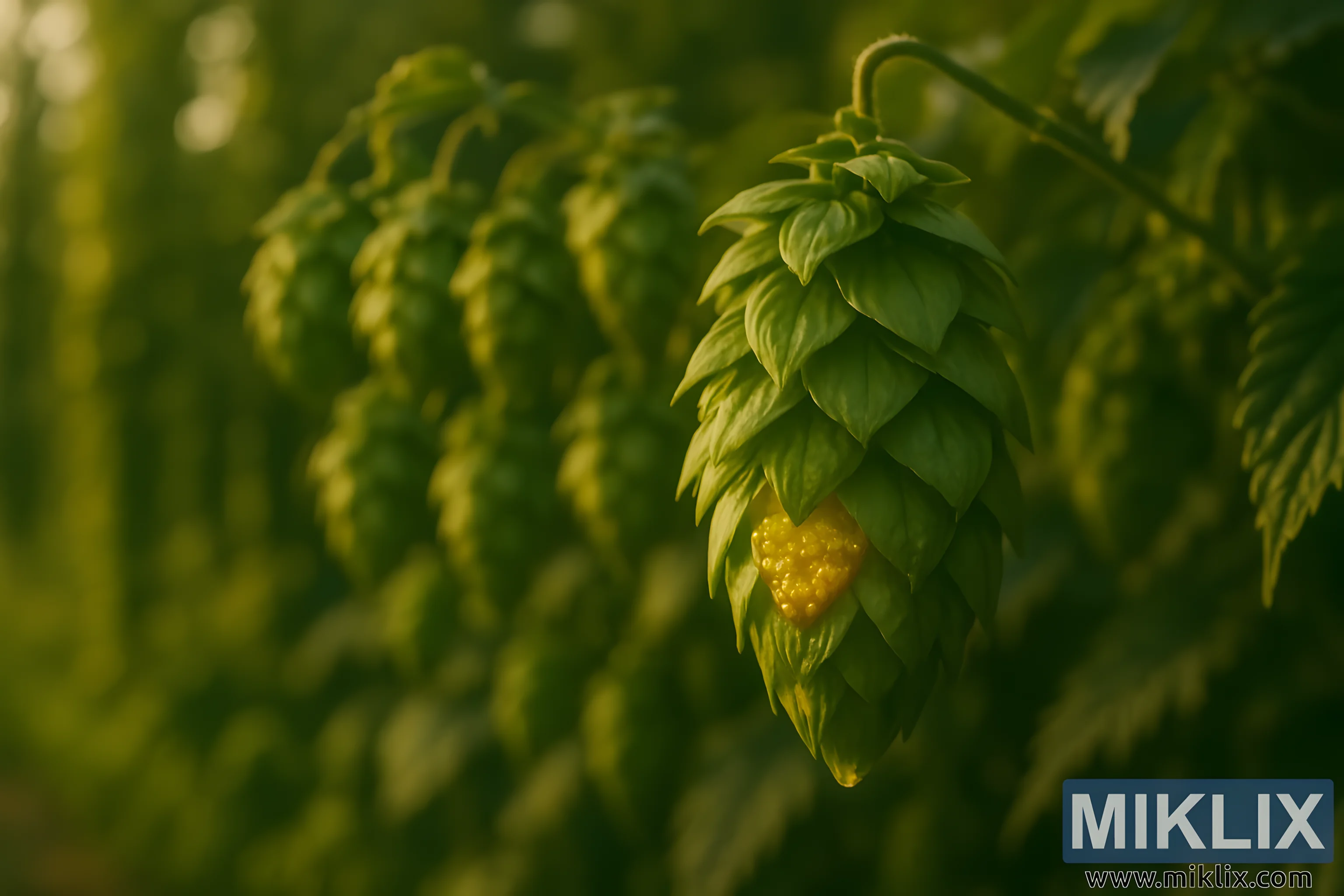 છબી: સૂર્યપ્રકાશિત ક્ષેત્રમાં બ્લેટો હોપ કોનનો સુવર્ણ ક્લોઝ-અપ