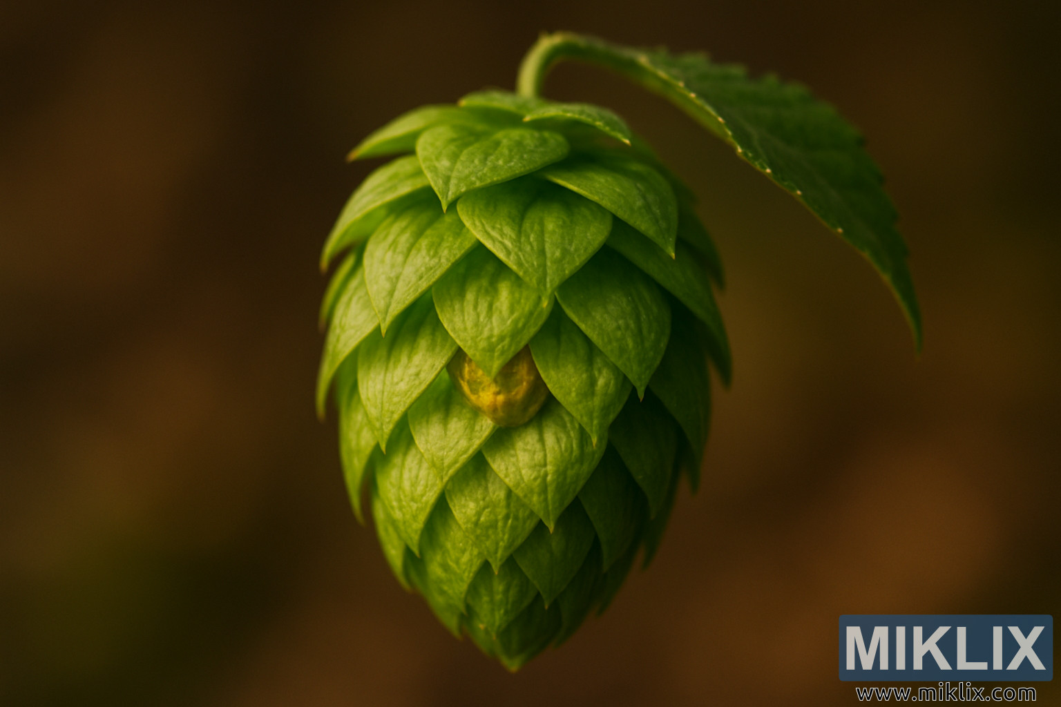 હોપ શંકુ એક સમૃદ્ધ, જીવંત લીલો રંગ છે, તેનો રંગ સૂક્ષ્મ રીતે બ્રૅક્ટ્સના પાયા પરના ઊંડા જંગલી ટોનથી લઈને તેમના હળવા વળાંકવાળા છેડા પર હળવા, વધુ તેજસ્વી લીલા રંગ સુધી વૈવિધ્યસભર છે. દરેક બ્રૅક્ટ એક ચોક્કસ, ઓવરલેપિંગ સર્પાકારમાં ગોઠવાયેલ છે જે આર્ટિકોકના ભીંગડા અથવા કડક રીતે ફરેલા ગુલાબની પાંખડીઓ જેવું લાગે છે. તેમની સપાટીઓ થોડી ટેક્ષ્ચરવાળી, લગભગ મખમલી છે, અને શંકુ પર વહેતા નરમ, સોનેરી પ્રકાશને પકડી રાખે છે અને પકડી રાખે છે. શંકુના કેન્દ્રની નજીક, તેના રેઝિનસ કોરની ઝલક દેખાય છે: સોનેરી લ્યુપ્યુલિન ગ્રંથીઓનો એક નાનો, ચમકતો સમૂહ વિભાજીત બ્રૅક્ટ્સ વચ્ચેથી ડોકિયું કરે છે, જે અંદર રહેલા સમૃદ્ધ સુગંધિત તેલ તરફ સંકેત આપે છે.