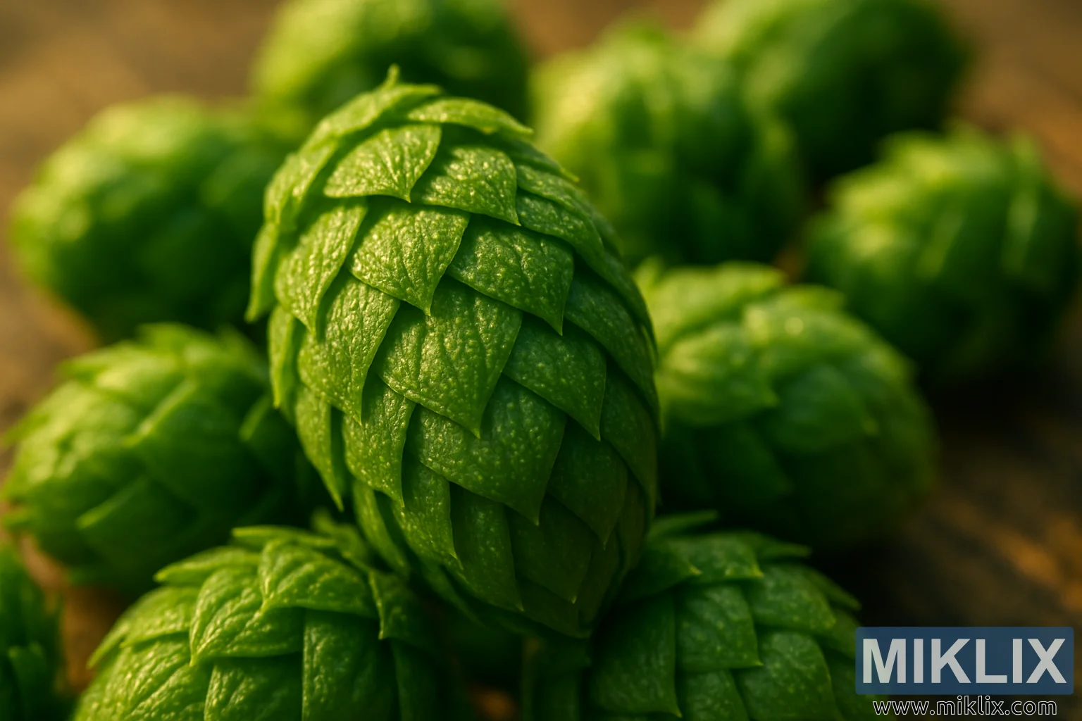 કુદરતી પ્રકાશ ગરમ અને સોનેરી છે, જે બપોરના અંતમાં સૂર્યપ્રકાશ બાજુથી ત્રાંસી રીતે અંદર આવતો હોવાનું સૂચવે છે. આ પ્રકાશ નરમ, વિસ્તરેલ પડછાયાઓ બનાવે છે જે હોપ શંકુને રૂપરેખા આપે છે, તેમના પરિમાણીય સ્વરૂપને વધારે છે અને છબીને સ્પર્શેન્દ્રિય વાસ્તવિકતાની ભાવના આપે છે. પ્રકાશની હૂંફ લીલા રંગછટાને સમૃદ્ધ બનાવે છે, તેમને ધાર પર ધીમેધીમે પીળા રંગ તરફ ખસેડે છે જ્યાં બ્રેક્ટ્સ પાતળા થાય છે, જ્યારે પડછાયાઓ આંતરિક ફોલ્ડ્સને સમૃદ્ધ જંગલી ટોન તરફ ઊંડા કરે છે. તેમની નીચે લાકડાની સપાટી ઝાંખી છે છતાં એટલી દૃશ્યમાન છે કે તે માટીના ભૂરા રંગનો કાઉન્ટરપોઇન્ટ આપે છે જે હોપ્સની હરિયાળીને પૂરક બનાવે છે અને તેમના કાર્બનિક સંદર્ભને મજબૂત બનાવે છે.