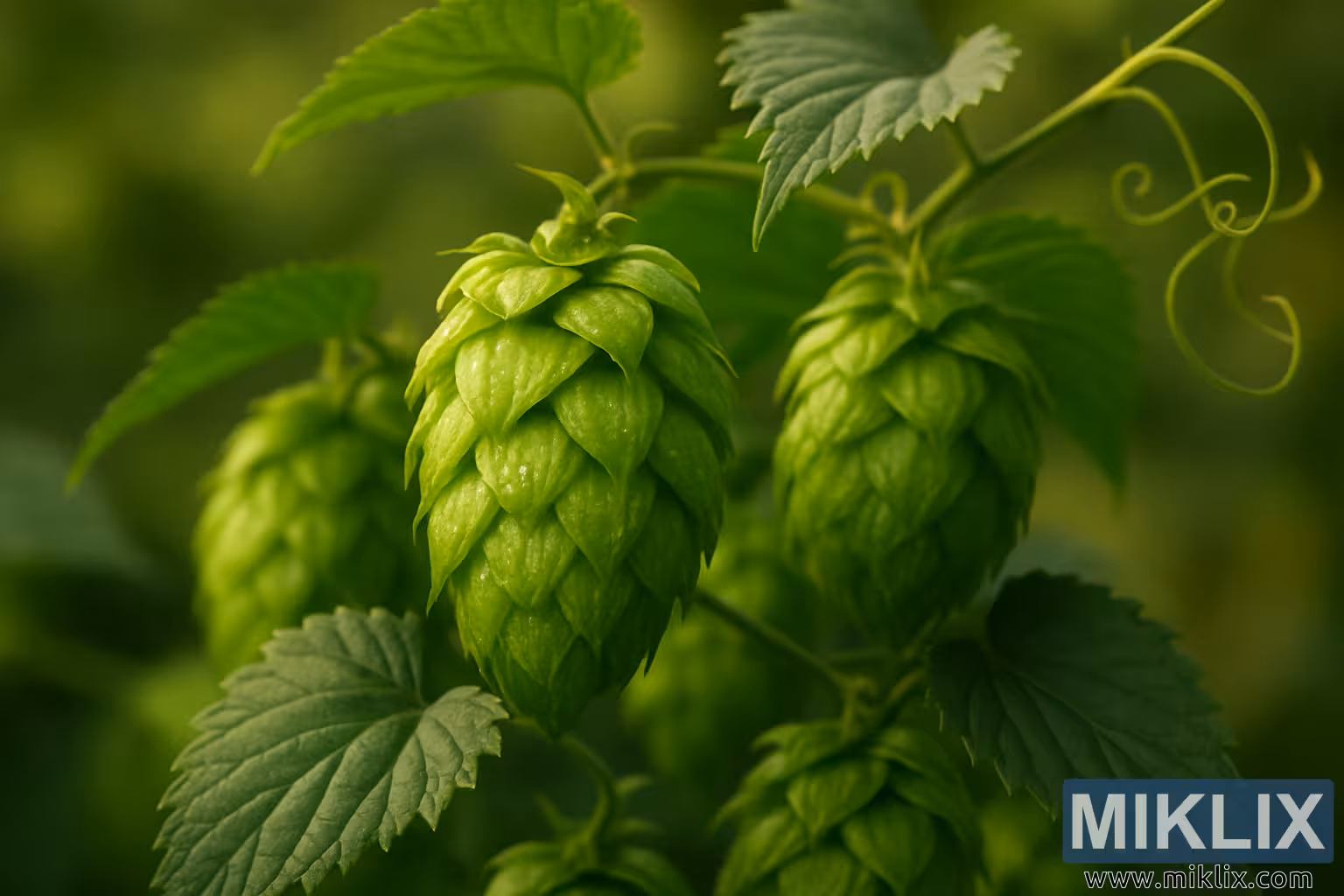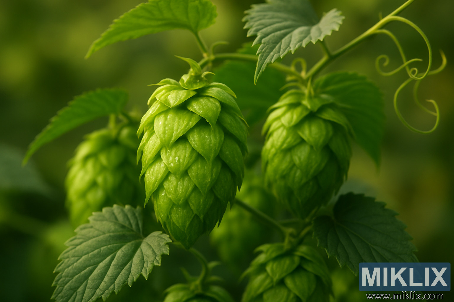 સુંદર, નાજુક વેલાના ટેન્ડ્રીલ્સ આસપાસના પર્ણસમૂહમાંથી બહાર નીકળે છે, સરળતાથી સુંદરતાથી વળાંક લે છે અને વળાંક લે છે. આ ટેન્ડ્રીલ્સ શંકુને ફ્રેમ કરે છે, જેમ જેમ તેઓ લૂપિંગ ચાપમાં બહાર પહોંચે છે તેમ તેમ કાર્બનિક ગતિશીલતા અને જીવનશક્તિનો અહેસાસ ઉમેરે છે, જાણે ધીમેધીમે પ્રકાશ તરફ ખેંચાય છે. શંકુની આસપાસના પાંદડા ઊંડા દાંતાદાર અને સહેજ ટેક્ષ્ચરવાળા હોય છે, તેમની સપાટીઓ એક ઝાંખી મખમલી ચમક ધરાવે છે જે પ્રકાશને ફેલાવે છે અને હોપ બ્રેક્ટ્સના વધુ ચળકતા દેખાવ માટે એક સુખદ વિરોધાભાસ બનાવે છે. કેટલાક પાંદડા અગ્રભૂમિમાં બેસે છે, નરમાશથી ઝાંખા પડે છે, જ્યારે અન્ય પૃષ્ઠભૂમિમાં પાછળ હટી જાય છે, લીલા રંગની સ્તરવાળી ટેપેસ્ટ્રી બનાવે છે જે કેન્દ્રિય વિષયને આવરી લે છે.