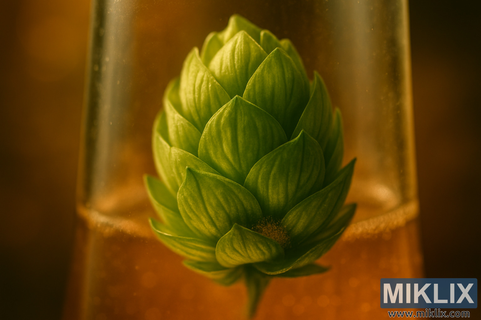 આ ક્લોઝ-અપ હોપને લગભગ પવિત્ર લટકતી સ્થિતિમાં કેદ કરે છે, જાણે કે બે દુનિયા વચ્ચે ફસાયેલ હોય: એક પૃથ્વી અને તે ખેતરોમાં જ્યાં તે ઉગી હતી, અને બીજો પ્રવાહીમાં ડૂબેલો જે તેના સારને તૈયાર બીયરમાં લઈ જશે. કાચ એક કન્ટેનર અને સ્ટેજ બંને બની જાય છે, તેની સરળ દિવાલો તીક્ષ્ણ લીલા અને ઊંડા એમ્બર વચ્ચેના વિરોધાભાસને વધારે છે. વાસણમાં નરમ, ધુમ્મસવાળું પ્રતિબિંબ ધ્યાનની બહારની દુનિયાનો સંકેત આપે છે, રમતમાં રહેલી રાસાયણિક પ્રક્રિયાઓની યાદ અપાવે છે અને તેલ, એસિડ અને રેઝિનના સૂક્ષ્મ સંતુલન જે હોપ્સને ઉકાળવા માટે અનિવાર્ય બનાવે છે.