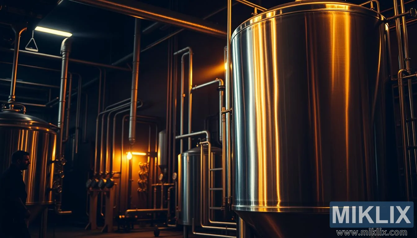 એક ઝાંખા બ્રુહાઉસમાં સ્ટેનલેસ સ્ટીલનો આથો, જે પાઈપો અને ગેજથી ઘેરાયેલો છે, જે એમ્બર પ્રકાશ અને ઉચ્ચ-ગુરુત્વાકર્ષણ આથોની તીવ્રતાને પ્રતિબિંબિત કરે છે.