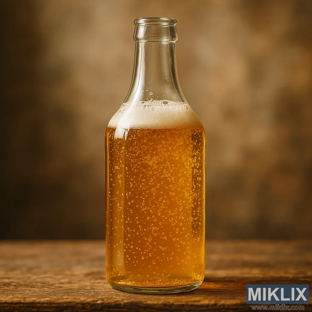 ફ્રેમના મધ્યમાં, બોટલ લાકડાની સપાટી પર ઉંચી ઉભી છે. તેની નીચે ટેબલ અથવા પાટિયામાં ઉંમરની રચના - અનાજની રેખાઓ, થોડી તિરાડો અને સમયનો નરમ પડતો ઘસારો - દ્રશ્યના કલાત્મક, પરંપરાગત વાતાવરણને પૂરક બનાવે છે. બોટલ પોતે સ્પષ્ટ, જાડા કાચમાંથી બનાવવામાં આવી છે, જે દર્શકને તેની સામગ્રીમાં સીધા જોવાની મંજૂરી આપે છે. અંદરનો પ્રવાહી ઊંડા સોનેરી રંગથી ચમકે છે, તેનો રંગ ગરમ, કુદરતી પ્રકાશથી પ્રકાશિત થાય છે જે એક બાજુથી ધીમેથી પડે છે. આ ચમક એક દ્રશ્ય હૂંફ બનાવે છે જે મીણબત્તીના પ્રકાશ અથવા ગામઠી બારીઓમાંથી ફિલ્ટર કરેલા બપોરના સૂર્યની યાદ અપાવે છે, જે જૂની દુનિયાની ઉકાળવાની પરંપરાઓના વિચારને મજબૂત બનાવે છે.