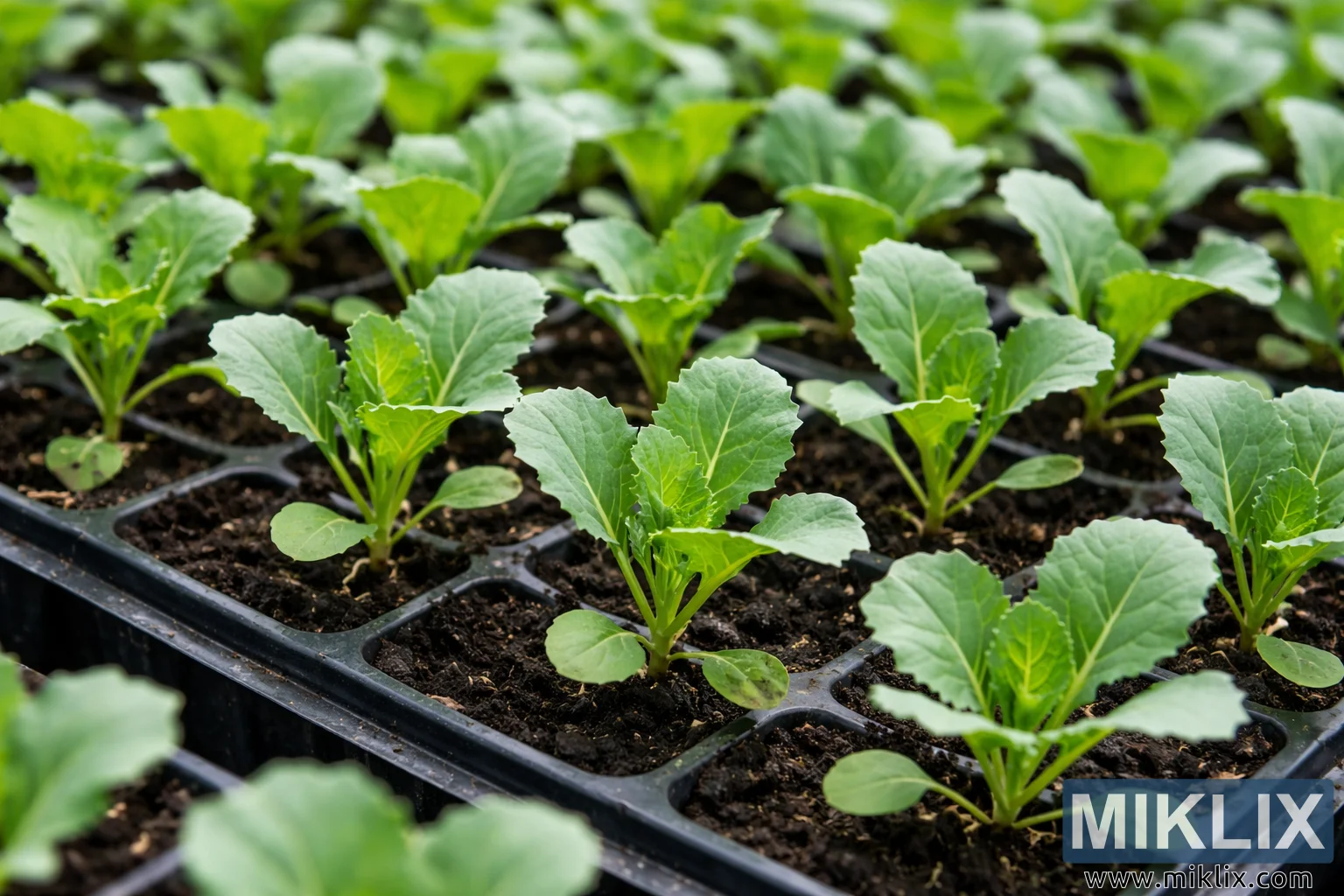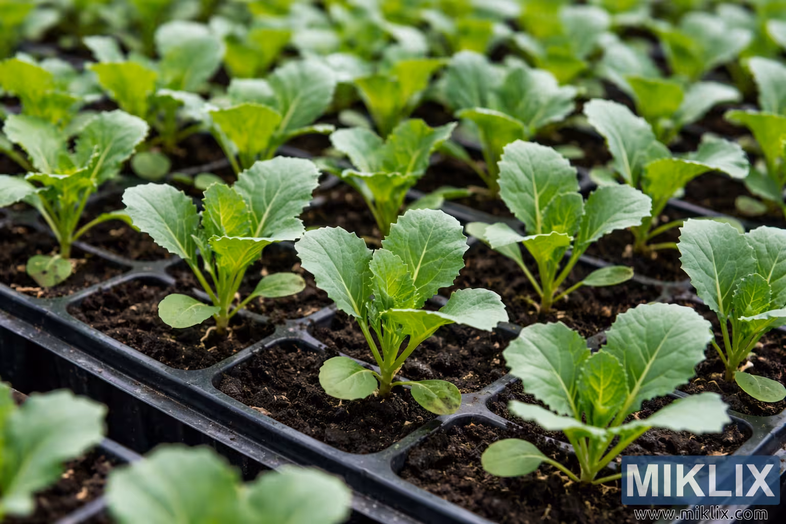 Hoton yana nuna faffadan yanayin ƙasa na tsirrai masu farin kabeji suna girma iri ɗaya a cikin baƙaƙen tiren iri na filastik. Kowane tire an raba shi zuwa ƙwayoyin murabba'i daban-daban, kuma a cikin kowace tantanin halitta an kafa shuka ɗaya a cikin ƙasa mai duhu, mai laushi mai laushi wanda ya yi kama da danshi da iska mai kyau. Tsire-tsire suna cikin matakin farko amma mai ƙarfi na ci gaba, tare da cotyledons har yanzu ana iya ganin su kusa da tushe kuma ganyayyaki na farko na gaske suna fitowa a sarari a saman su. Ganyen gaskiya suna da faɗi kuma sun fi tsari fiye da ganyen iri na farko, tare da gefuna masu laushi a hankali da kuma jijiya ta tsakiya daban-daban wanda ke rarrafe zuwa ƙananan jijiyoyin, yana ba ganyen bayyanar lafiyayye da kyau. Launin ganyen ya bambanta daga haske zuwa matsakaici kore, yana nuna girma mai aiki da wadataccen abinci mai gina jiki, yayin da tushen suka yi gajeru, ƙarfi, da kore mai haske, yana nuna yanayin haske mai ƙarfi da ƙarancin shimfiɗawa. Tsire-tsire suna da tazara daidai gwargwado, suna ƙirƙirar tsarin geometric mai maimaitawa a fadin firam ɗin yayin da tiren suka koma baya. Zurfin filin ba shi da zurfi ko matsakaici: tsire-tsire a gaba suna da hankali sosai, suna bayyana kyawawan bayanai kamar yanayin ganye, sheƙi mai laushi a saman ganye, da ƙananan barbashi na ƙasa, yayin da tsire-tsire a baya suke laushi a hankali zuwa haske mai laushi. Wannan tasirin gani yana jaddada ƙarfin layukan gaba yayin da har yanzu yana isar da girman shukar. Haske na halitta ne kuma yana yaɗuwa, wataƙila daga gidan kore ko wurin yaɗuwa mai haske, ba tare da inuwa mai ƙarfi ba; maimakon haka, hasken yana haskaka ganyen daidai gwargwado, yana haɓaka kamanninsu sabo da kyau. Gabaɗaya yanayin yana isar da noma mai kyau da yanayin girma mai sarrafawa, wanda ya saba da noman lambu na ƙwararru ko wanda aka kula da shi sosai. Tsarin tsari, girman shuka mai daidaito, da rashin kwari ko lalacewa da ake gani duk suna ƙarfafa ra'ayin tsirrai masu lafiya, waɗanda aka shirya don ƙarin girma ko kuma a dasa su cikin manyan kwantena ko ƙasa buɗe.
