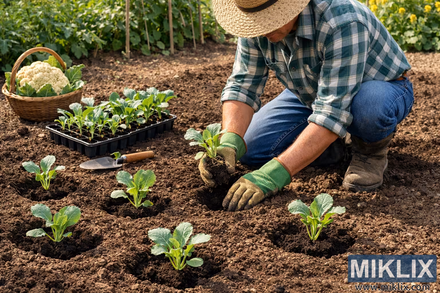 Transplanting Cauliflower Seedlings in a Prepared Garden Bed