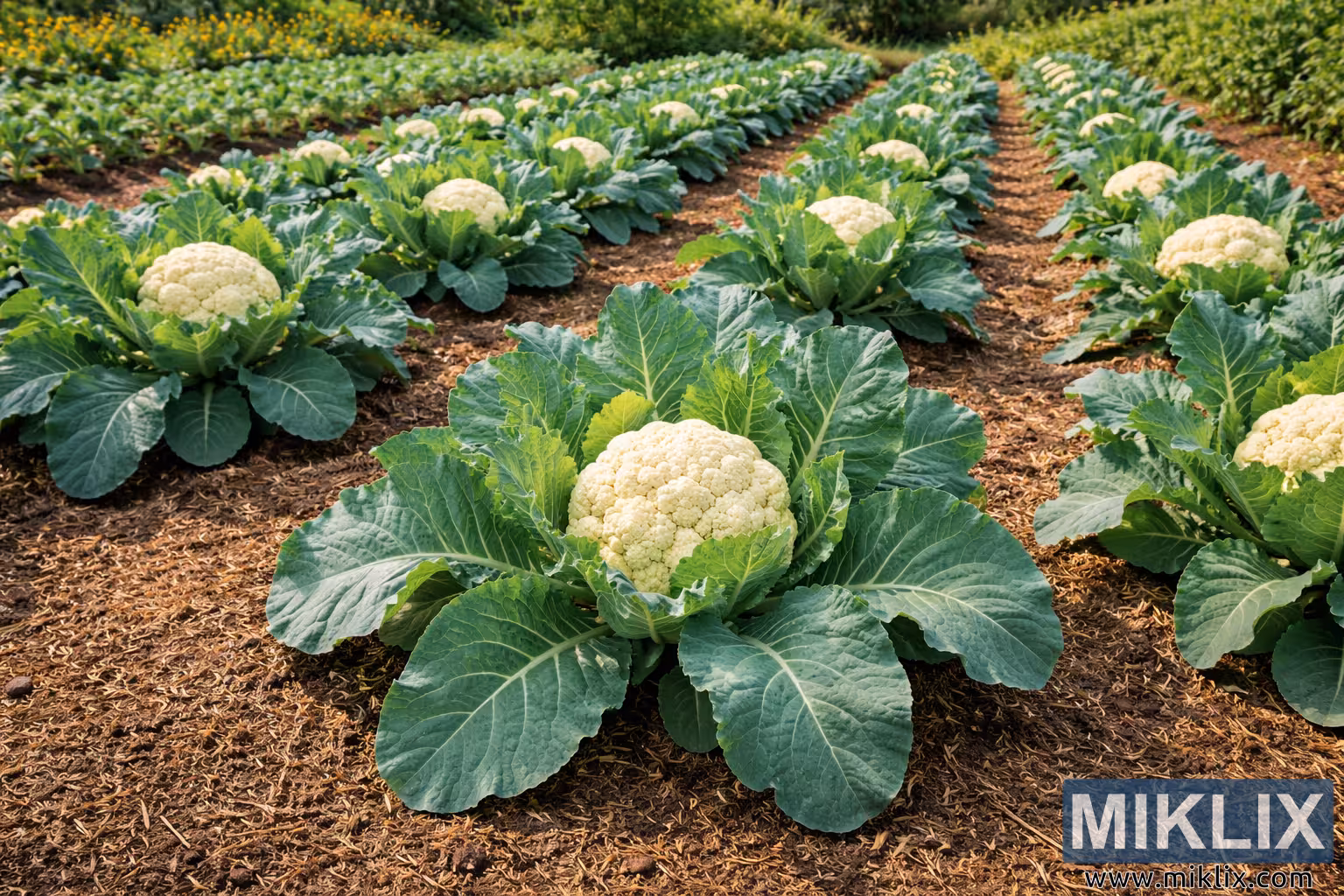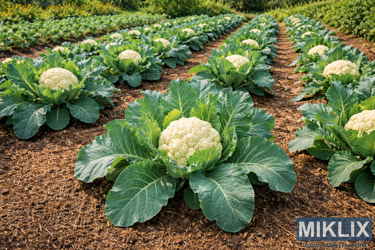 Healthy Cauliflower Garden with Mulched Rows