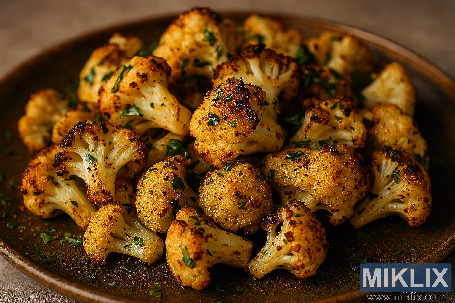 Kayan ƙanshin yana da haske kuma an rarraba shi da kyau. An yayyafa sabon faski, an yanka shi da kyau, ana yayyafa shi a kan abincin, launinsa mai haske kore yana ba da bambanci mai kyau ga launukan ɗumi na farin kabeji da aka gasa. Ana kuma yayyafa furannin da gaurayen kayan ƙanshi, ciki har da barkono baƙi, barkono ja, da foda mai launin rawaya - wataƙila turmeric - wanda ke manne a saman da ramukan farin kabeji marasa daidaituwa. Waɗannan kayan ƙanshi ba wai kawai suna ƙara kyawun gani ba ne, har ma suna nuna ɗanɗano mai ƙarfi da ƙamshi.