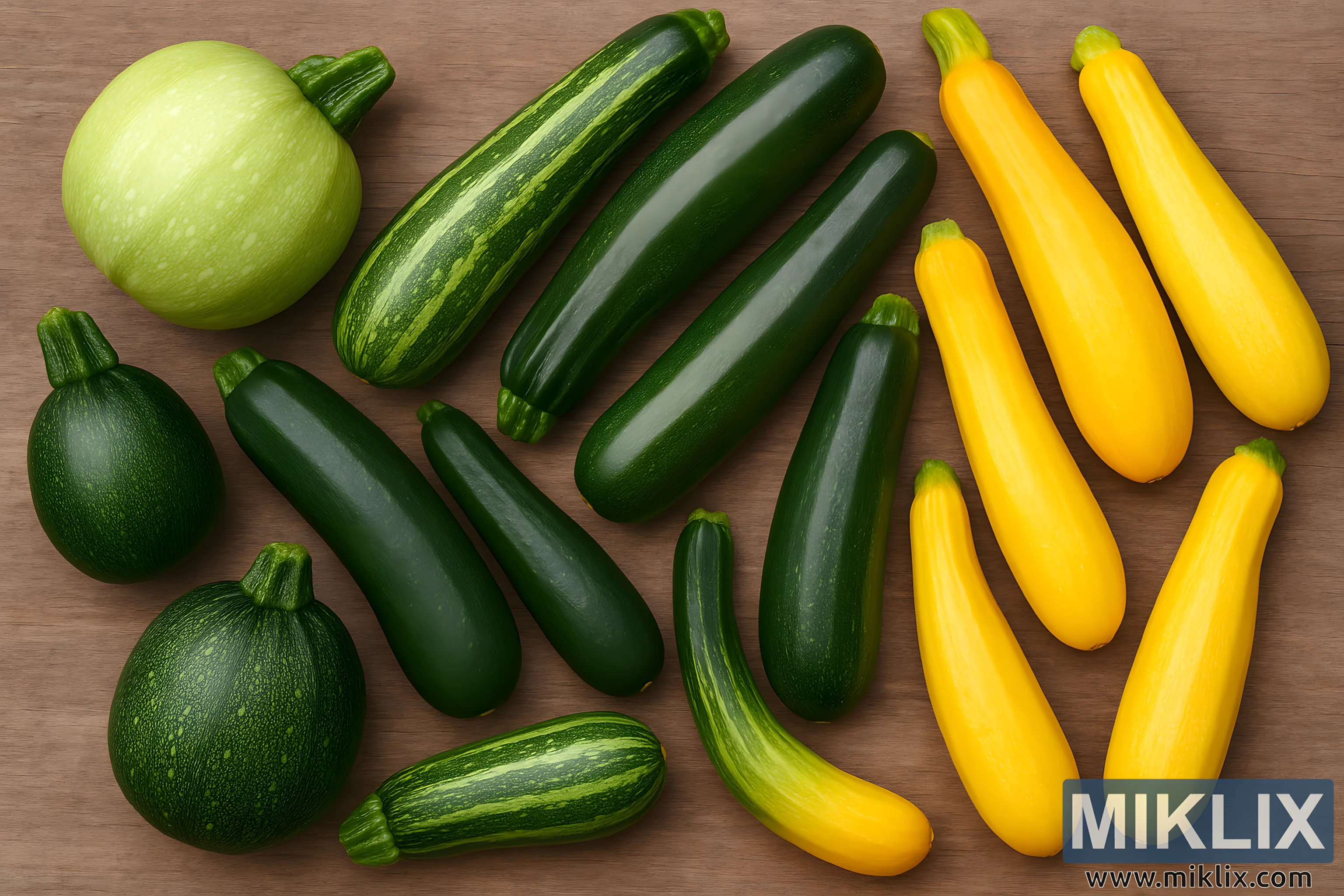 Colorful Zucchini Varieties on Wooden Surface