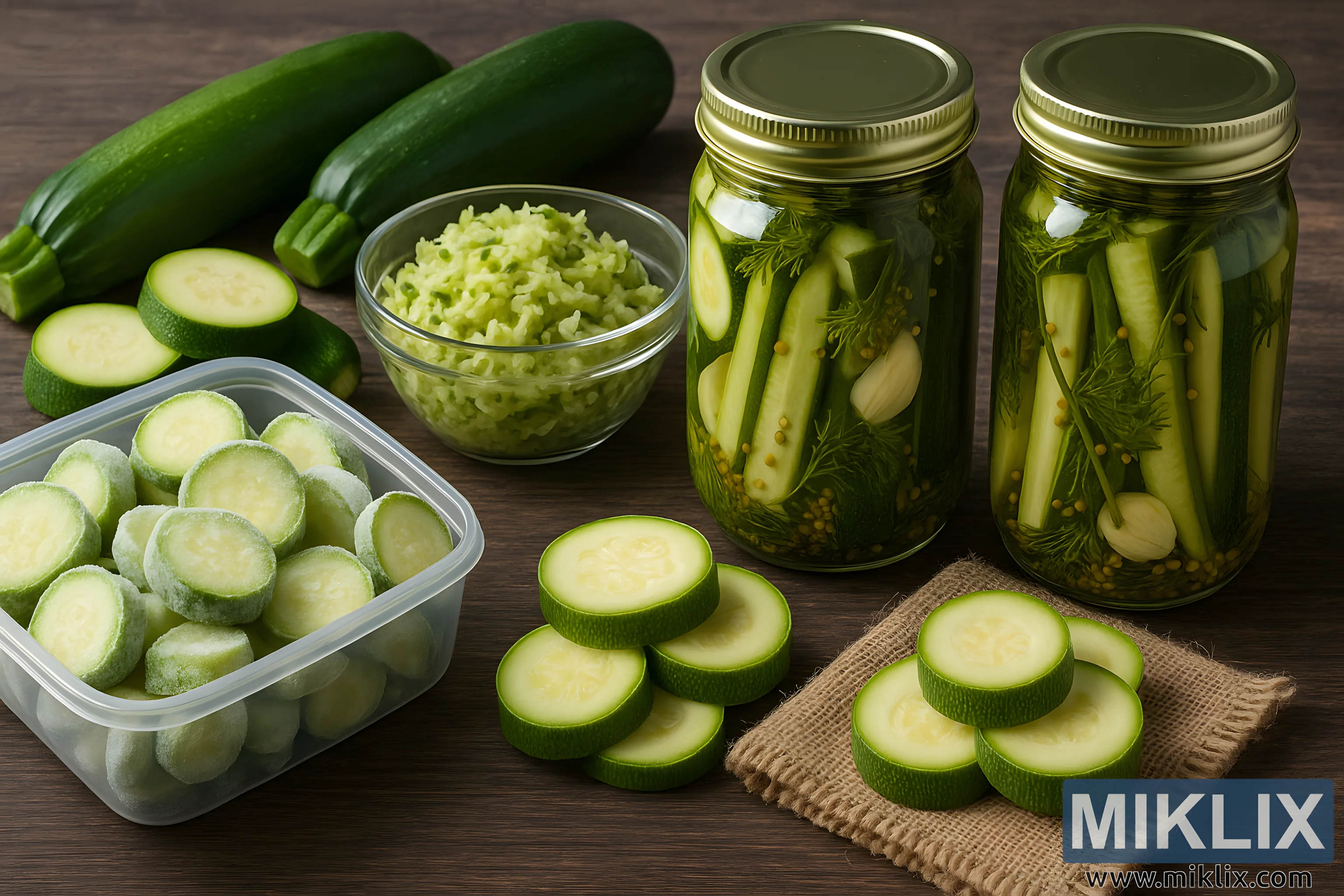 Cikakken hoto na hanyoyin adana zucchini daban-daban, ciki har da yanka daskararre, zucchini da aka soya, da zucchini da aka yayyanka a cikin kwalba.