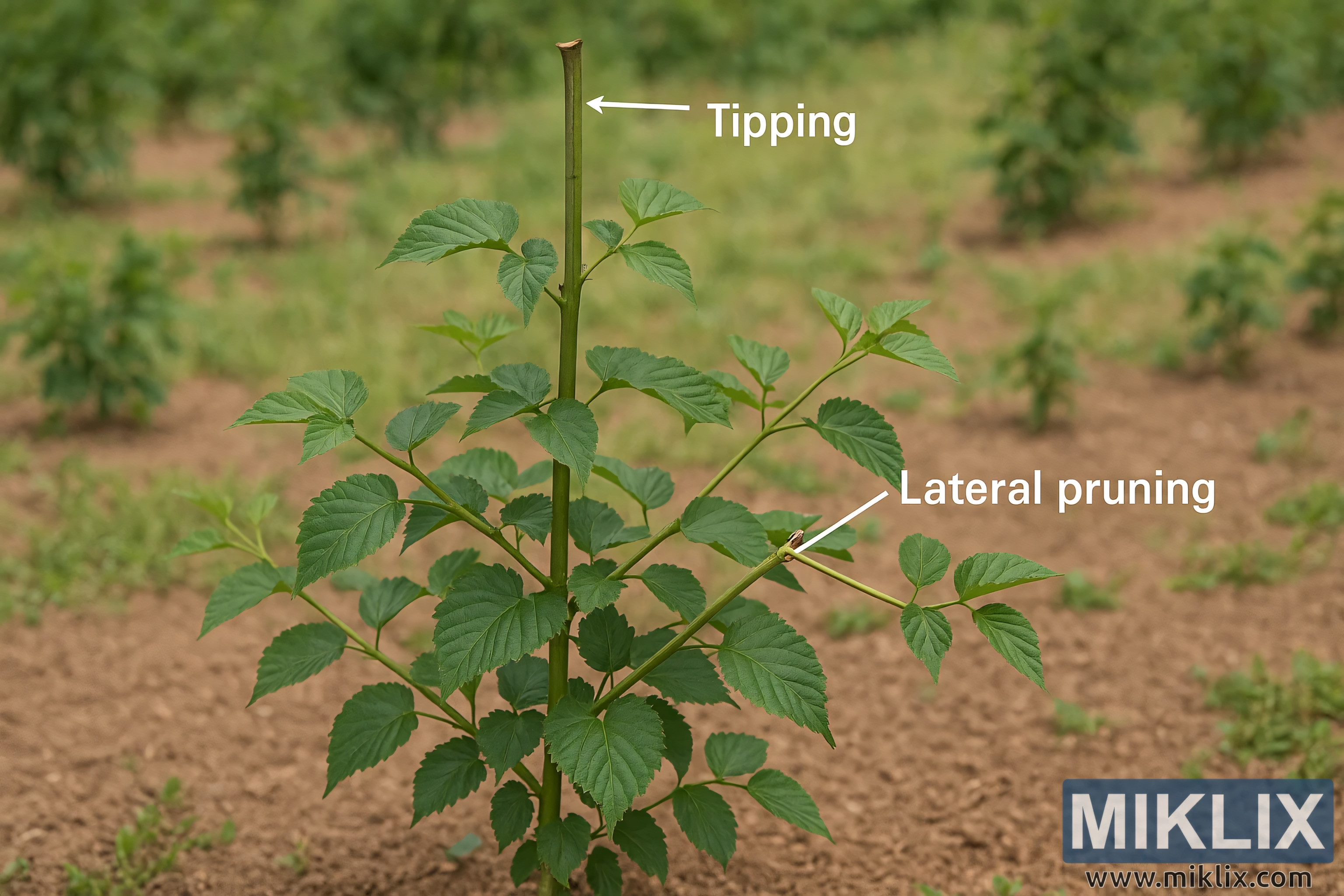 Tsakiyar tsakiyar shukar, wata kibiya mai lakabin 'Lateral pruning' tana nuna reshe na gefe wanda shima aka datse. Wannan reshe yana fitowa waje daga babban sanda kuma an yanke shi zuwa wani ɗan gajeren tsayi, yana nuna yadda ɓangarorin gefe ke sarrafa siffar shuka, inganta yanayin iska, kuma yana jagorantar makamashin shuka zuwa ga harbe-harbe masu 'ya'ya. Yanke yankan gefe, kamar yanke tipping, yana da tsabta kuma da gangan, yana nuna daidaito a cikin kula da kayan lambu.
