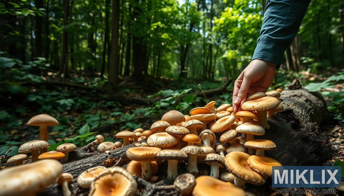 Mutum yana zaɓar namomin kaza a hankali kamar shiitake, kawa, da crimini a cikin gandun daji mai haske mai haske, yana ba da haske na halitta da kuma godiya ga yanayi.