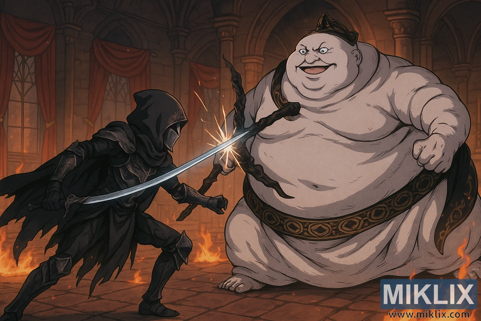 Kishiyasa yana tsaye da Godskin Noble, babba a sikeli, ƙoshi da kodadde, tare da nama mai laushi mara yuwuwa da smug, muguwar magana ta miƙe a fuskarsu. Ciki da manyan gaɓoɓi masu nauyi an tsara su da baƙar fata da zinare na ado da aka lulluɓe a jikin jikin jikin kamar rigar al'ada, yayin da ma'aikatansu ke lanƙwasa waje cikin sifofin da ba za a iya yiwuwa ba kamar tushen rai ko kuma ƙashin ƙashi. Murmushin Noble - fadi, kusan farin ciki - ya bambanta sosai da ƙudirin shiru na ɗan wasan. Suna da tabbaci, sun kusan jin daɗi, kamar yaƙin nishaɗi ne maimakon barazana.