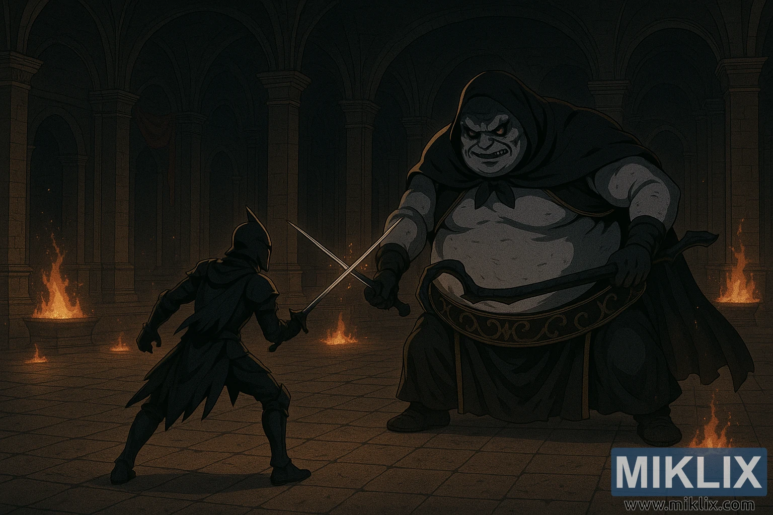 Wannan zane-zane yana gabatar da wani hoto mai faɗi mai ban mamaki wanda Elden Ring ya yi wahayi, wanda aka yi shi cikin salon anime mai ɗorewa wanda ke jaddada sikeli, yanayi, da tsayuwar daka tsakanin manyan abokan gaba biyu. Lamarin ya bayyana ne a cikin kogon dutsen mai aman wuta, inda ginshiƙai masu tsayi da ginshiƙan duwatsu masu duhu suka shimfiɗa sama sama, suna ɓacewa cikin inuwa. Zauren yana jin daɗaɗɗen daɗaɗawa, babban gine-ginensa da sanyi, an ƙara jaddadawa yanzu da aka ja da kyamarar baya, yana bayyana ƙarin yanayin da ke haifar da arangama. Wuraren wuta suna ƙonewa a cikin tarwatsewar braziers a kewayen ɗakin, ruwan lemunsu na yawo a ƙasa yana jefa tunani cikin duhu. Inuwa suna da tsayi, zurfi, da rashin kwanciyar hankali, suna ƙara nauyi ga kwanciyar hankali kafin yajin na gaba.