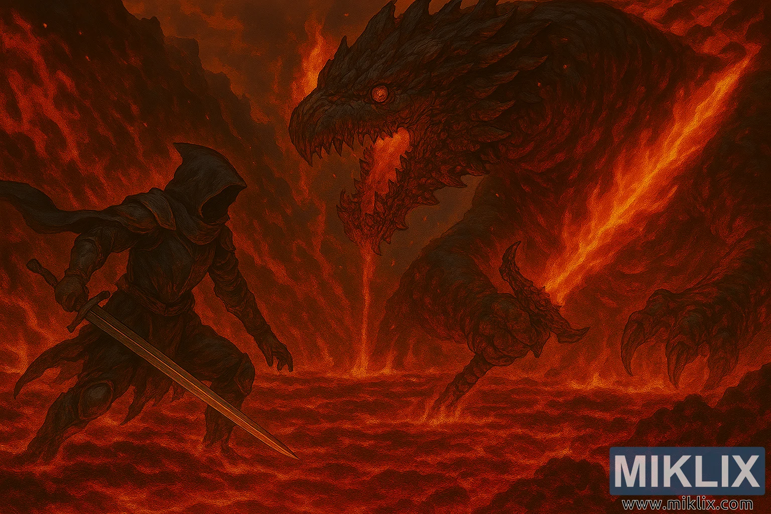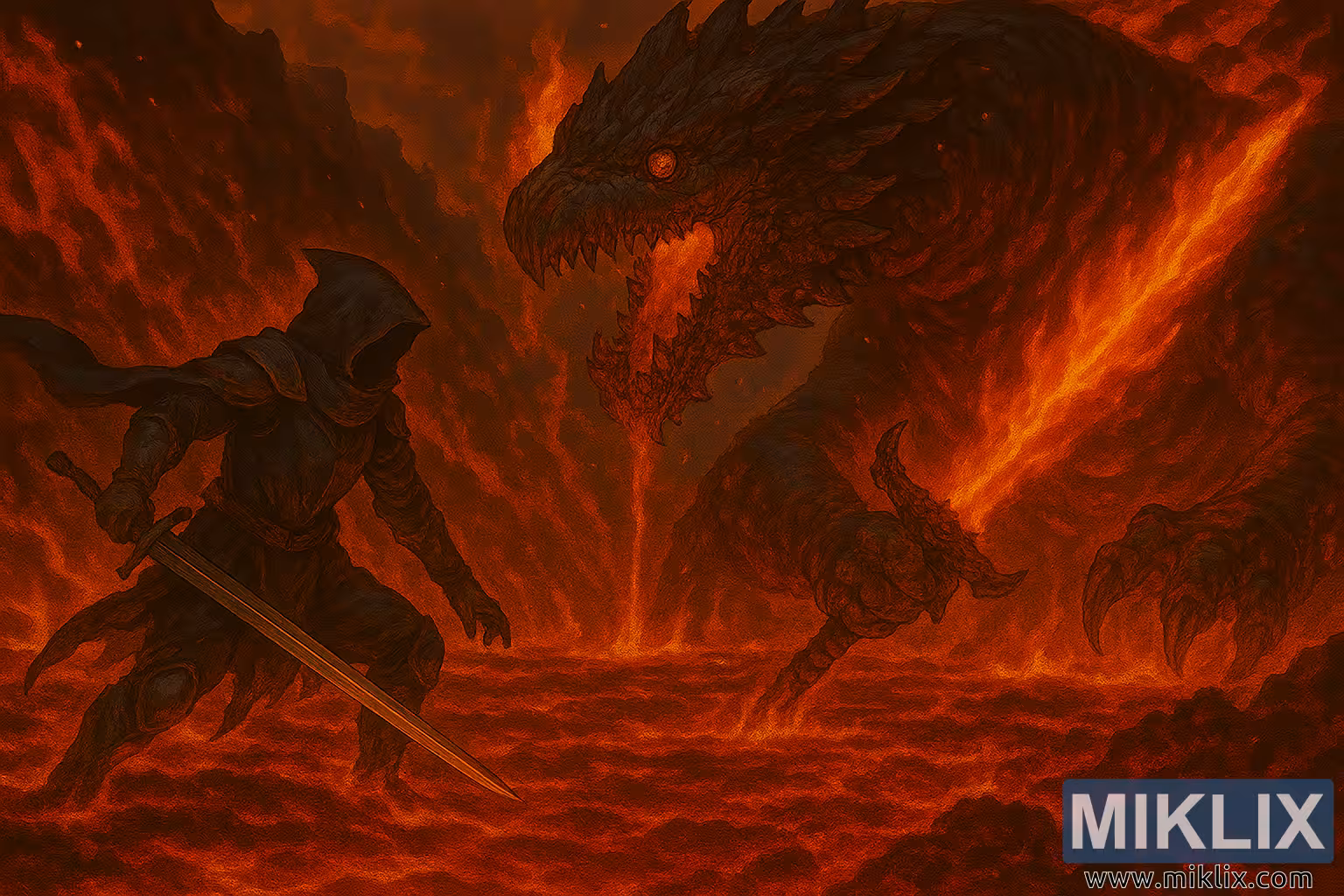 Mai adawa da shi shine Magma Wyrm, wata gurbatacciyar halitta mai kama da dodon da ta haye saman fagen fama. Jikinsa an lullube shi da jakunkuna, ma'auni na obsidian-baƙar fata tare da kyalkyali masu kyalkyali na narkakkar lava da ke juyewa ta hanyar sa. Katon katon halittar yana da kambin kashin dutse, idanunta suna ƙona da fushin zinare, buɗaɗɗen ɗigon ruwanta kuma tana digewa da narkakkar wuta. Musamman ma, Wyrm yana riƙe da takobi mai harshen wuta a cikin farantin gabansa na dama-a sarari kuma a haɗe-haɗe-wanda ke sama a cikin baka mai ban tsoro. Ruwan ruwa yana haskaka zafi mai tsanani, harshen wuta yana lasa sama yana jefa wuta mai zafi a cikin ma'aunin Wyrm da kewayen lafazin.