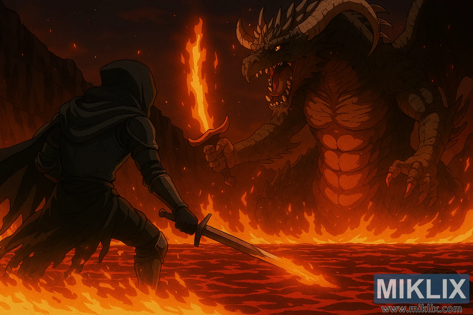 Wani hoto mai ban mamaki irin na anime yana ɗaukar yaƙi mai zafi tsakanin Tarnished da Magma Wyrm a cikin Elden Ring, wanda aka saita a cikin zurfafan zurfafan tafkin Lava kusa da Fort Laiedd. An nuna wurin cikin babban tsari tare da m cel-shading da fantasy haƙiƙanin gaske, yana mai jaddada tsananin adawar.