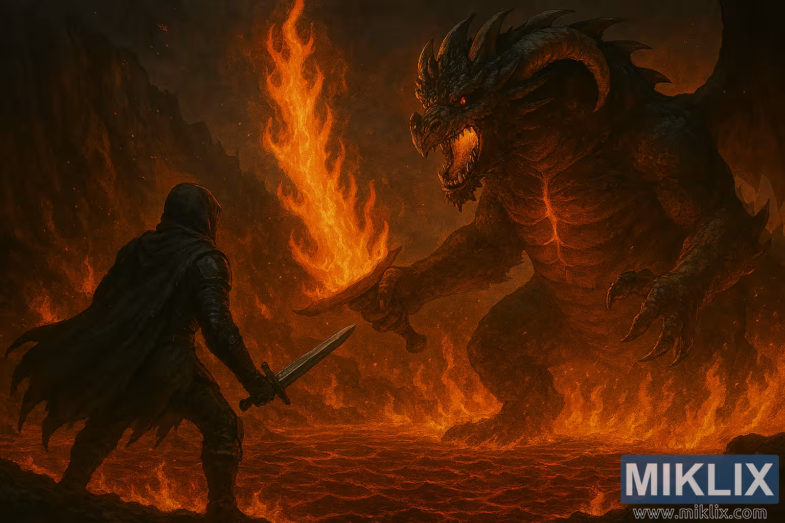 Mallake gefen dama na hoton shine Magma Wyrm, yanzu an daidaita shi zuwa girman girman. Jikinta na macijin yana lullube da jakunkuna, ma'auni mai aman wuta, tare da fissures na lemu masu haske suna gudana tare da ƙirjinsa da ciki. An yi wa kan wyrm rawanin manya-manyan ƙahoni masu lanƙwasa da idanun amber masu ƙyalli waɗanda ke haskaka fushi. Bakinsa a buɗe a cikin ƙulle-ƙulle, yana bayyana layuka na hakora masu kaifi da wuta a ciki. A cikin katsewar hannun dama, wyrm ɗin yana riƙe da babban takobi mai harshen wuta - wurginsa ya cinye cikin wuta mai ruri, ya miƙe sama da kansa yana ba da haske mai ƙarfi a fagen daga.
