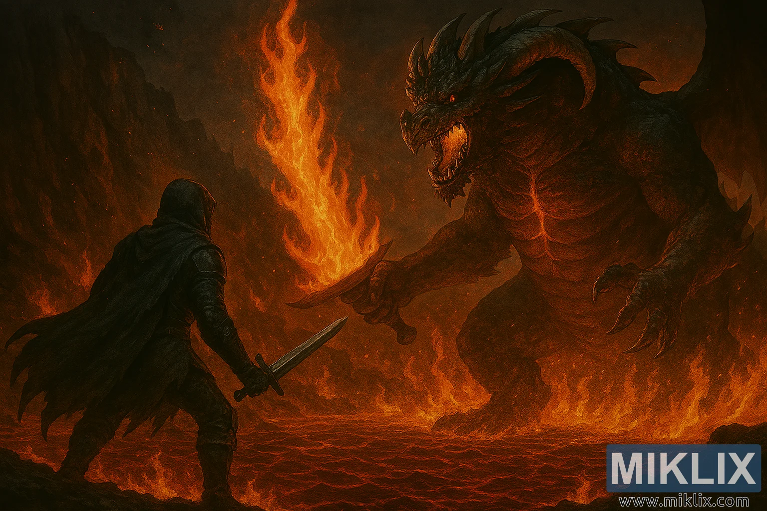 Haske yana taka muhimmiyar rawa a cikin abun da ke ciki. Takobin wuta da lava suna ba da haske na farko, suna ba da haske mai zafi da inuwa mai zurfi a cikin haruffa da ƙasa. Bambance-bambancen da ke tsakanin haske mai dumi da makamai masu duhu da duwatsu suna haɓaka yanayi da gaskiya.