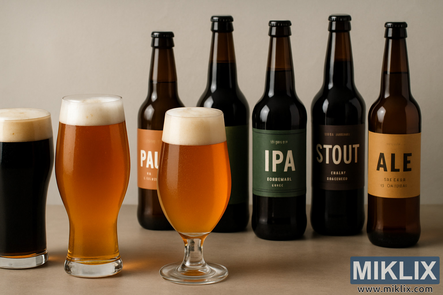 Bayan gilashin, jeri mai tsari na kwalaben giya na fasaha yana samar da gada ta gani tsakanin gaba da baya. Kowace kwalabe tana da ƙira mafi ƙarancin ƙira wanda ke nuni ga keɓantaccen halayen abubuwan da ke cikinta - lagers masu tsafta tare da tsaftataccen rubutu, rubutun rubutu mara kyau, ƙaƙƙarfan ƙwanƙwasa tare da haruffa masu ƙarfin hali, IPAs masu gaba-gaba ta amfani da sautunan ƙasa, da santsi mai santsi wanda aka yiwa alama da dumi, palette mai gayyata. Siffofin kwalaben ɗaiɗaikun suna ba da tsayayye na gani na gani, yayin da alamun bambance-bambancen suna gabatar da iri-iri da ban sha'awa.
