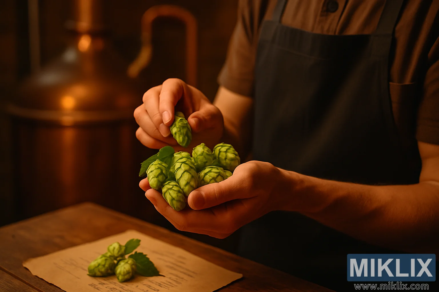 Ƙarƙashin hannun mai shayarwa, yana hutawa a kan tebur, akwai guntun fatun tsoho ko kuma rubutun katako, inda sauran hops da watakila bayanin ɗanɗano na farko ke kwance. Ko da yake wani ɓangare ya ɓoye, kasancewarsa yana ƙarfafa ƙwaƙƙwaran kimiyya da azanci na tsarin aikin noma, daidaita hankali tare da takardu.