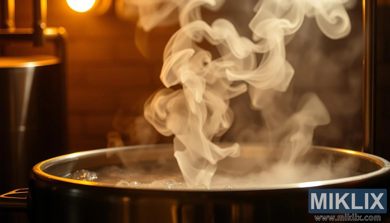Brewing kettle mai tururi a ƙarƙashin hasken zinari mai ɗumi, yana nuna tsarin aikin fasaha, haɓakar ɗanɗanon malt, da mahimmancin sarrafa zafin jiki wajen yin giya.