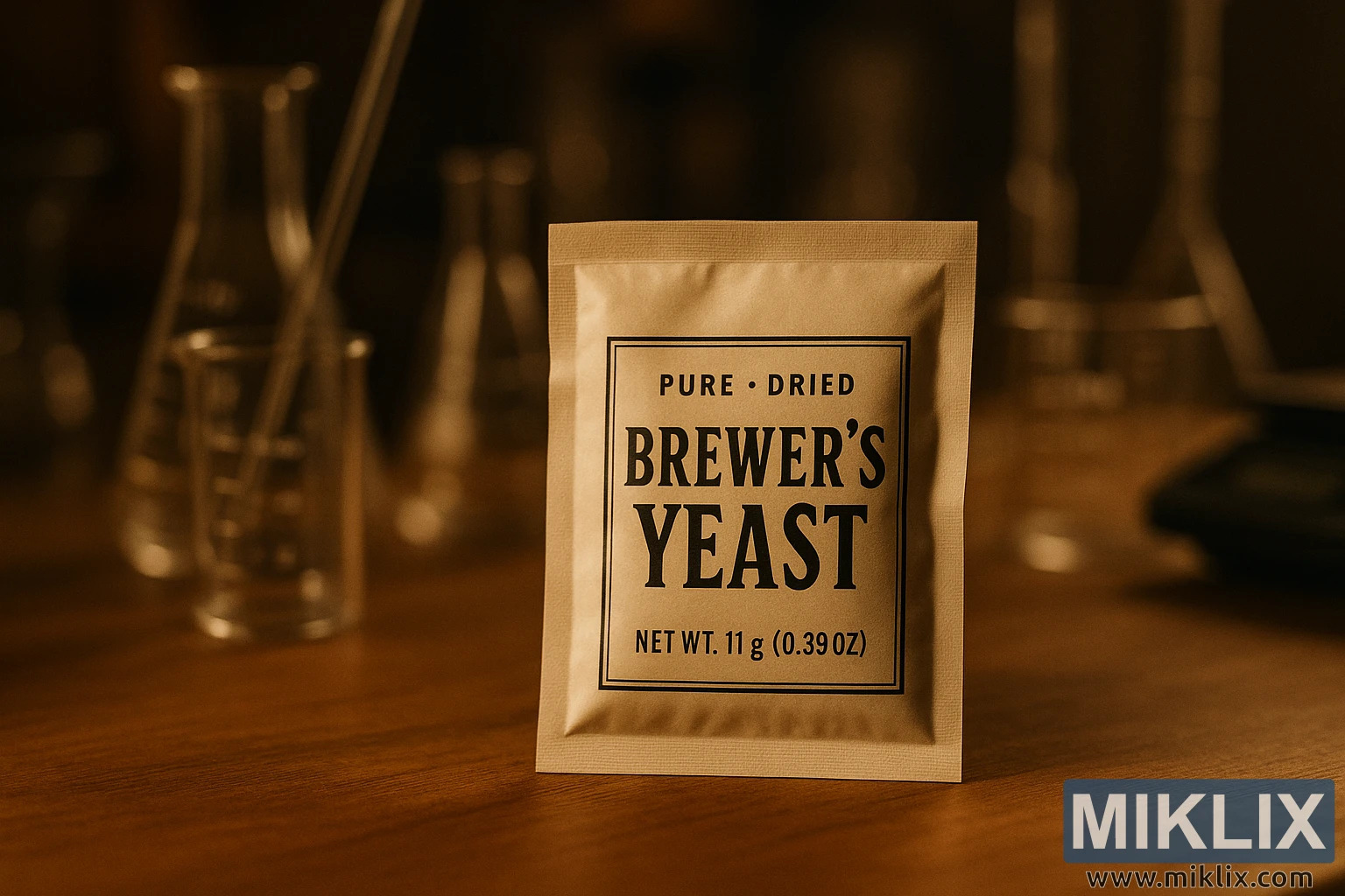 Jakar takarda mai lakabin Brewer's Yeast tana tsaye a kan tebur mai dumin itace, tana da haske sosai a kan faifan faifan gilashin da kayan aikin girki.