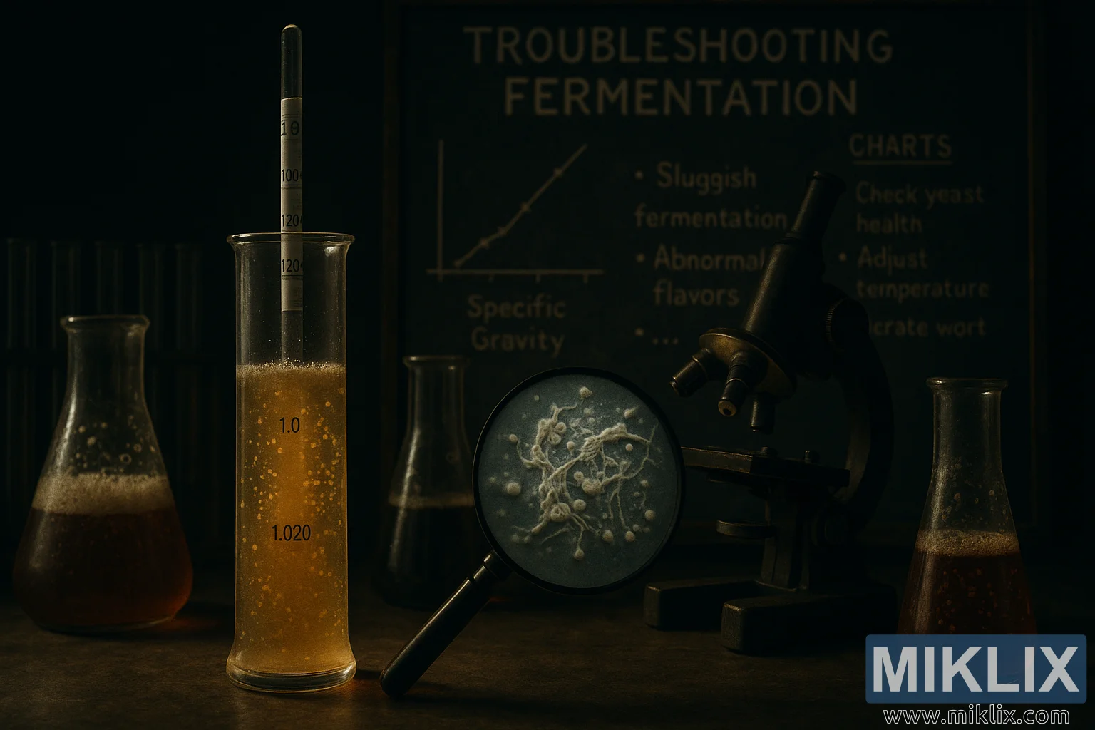 Dim Lab tare da hydrometer, microscope, da ƙwanƙwaran ƙwayoyin yisti, yana nuna ƙalubale a cikin magance matsalar hatsarori.