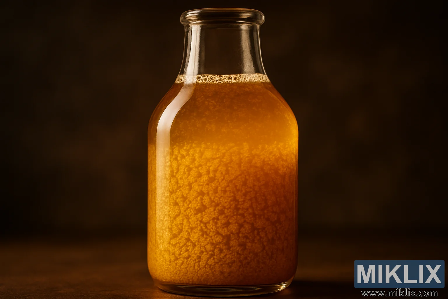 Kusa da saman ruwan, a ƙasan wuyan kwalbar, wani ɗan ƙaramin kumfa mai bakin ciki ko ƙananan ƙwayoyin cuta yana manne da gilashin ciki, yana nuna alamar carbonation mai laushi ko tashin hankali na kwanan nan. Wannan kunkuntar layin kumfa yana ƙara da dabarar rayuwa da fermentation, yana ƙarfafa ra'ayi cewa abubuwan da ke ciki suna aiki ta hanyar halitta maimakon a tsaye. Sama da wannan layin, wuyan kwalbar ya kasance babu komai kuma a sarari, yana ba da bambanci na gani tsakanin gilashi, iska, da ruwa.