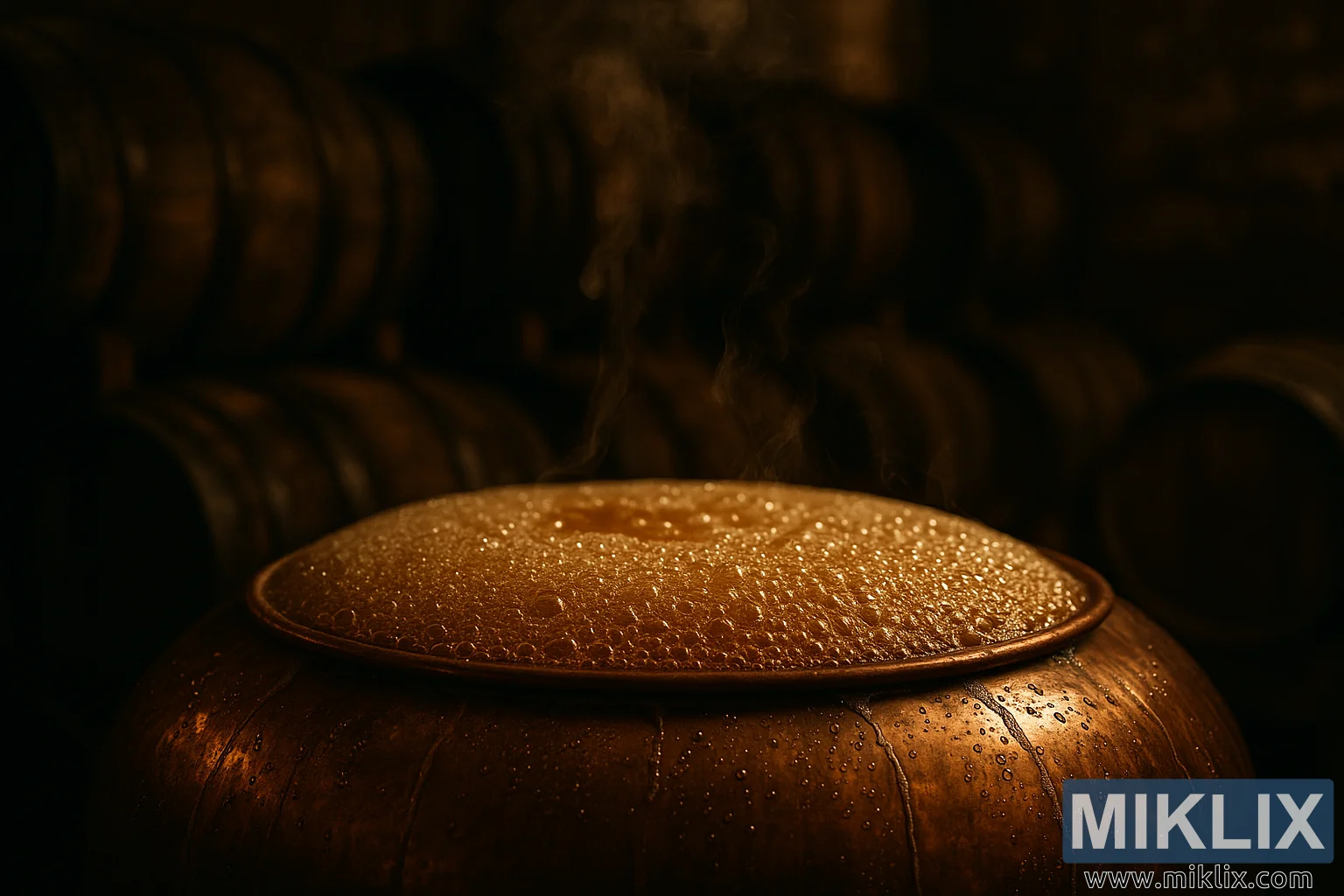 Wurin ɗakin shayarwar yanayi wanda ke nuna jirgin ruwa mai takin tagulla wanda aka lulluɓe da kumfa mai kumfa, tare da hasken zinari mai ɗumi, tururi mai tashi, da layuka na gangunan itacen oak a bango, yana haifar da nutsuwa, aikin haƙuri na fermentation mai kwandishi.
