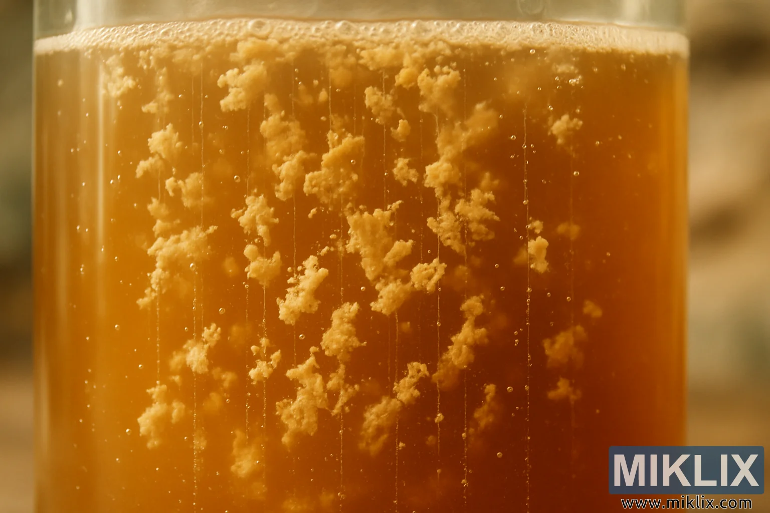 Hoton yana ba da kusanci, babban ƙuduri kusa da babban jirgin ruwan gilashin da ke cike da hammatacce, ruwan amber- zinare a tsakiyar fermentation mai aiki. Ruwan yana da rubutu sosai, rashin girman sa yana canzawa a hankali tsakanin translucent da gajimare kamar yadda sel da aka dakatar da yisti ke taruwa zuwa gungu masu taushi, marasa tsari. Waɗannan ɓangarorin ɓangarorin suna bayyana kusan kwayoyin halitta da kamar auduga, suna yawo a cikin ruwa kuma suna kama haske mai ɗumi cikin ƙaƙƙarfan tsari mara daidaituwa. Ƙananan kumfa masu yawa suna tashi daga ƙasa kuma ta cikin gungu na yisti a cikin rafukan tsaye a tsaye, suna ba da ma'anar ci gaba da motsi da ayyukan nazarin halittu.