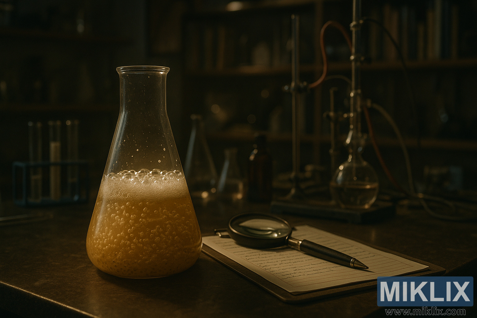 Bayan kwalbar, an sanya ta a gefen dama kaɗan, akwai allo mai ɗauke da takardar bayanan dakin gwaje-gwaje da aka rubuta da hannu. Duk da cewa rubutun ba a iya karantawa sosai ba, tsarin da sassan da aka ja layi a ƙasa suna nuna abubuwan da aka tsara ko kuma tarihin ci gaban gwaji. Gilashin ƙara girman da ke da hannun duhu yana kan takardun, an karkatar da shi zuwa ga mai kallo kamar an ajiye shi kwanan nan, yana nuna ci gaba da bincike. Ana sanya alkalami a kusa da shi da kyau, wanda ke ƙarfafa jin cewa wani yana rubuta abubuwan da aka gano.