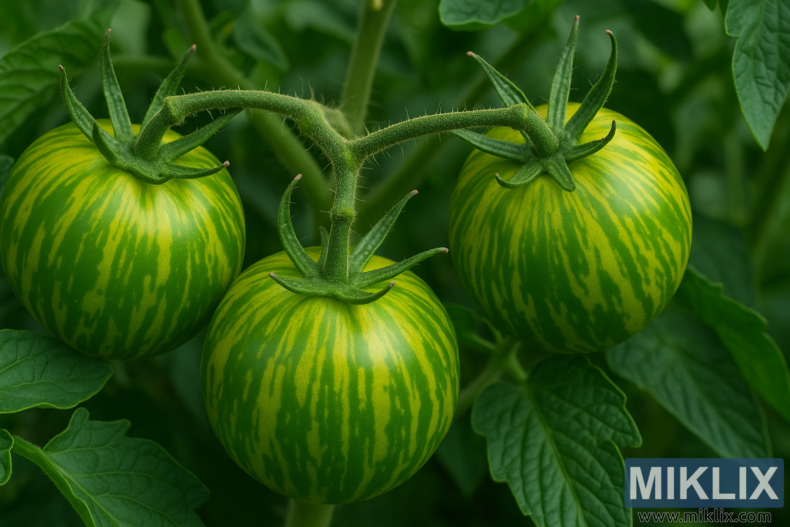 מבט מקרוב מפורט של עגבניות זברה ירוקות הגדלות על הגפן, מציגות את הפסים הירוקים והצהובים הייחודיים שלהן בין עלווה עבותה.