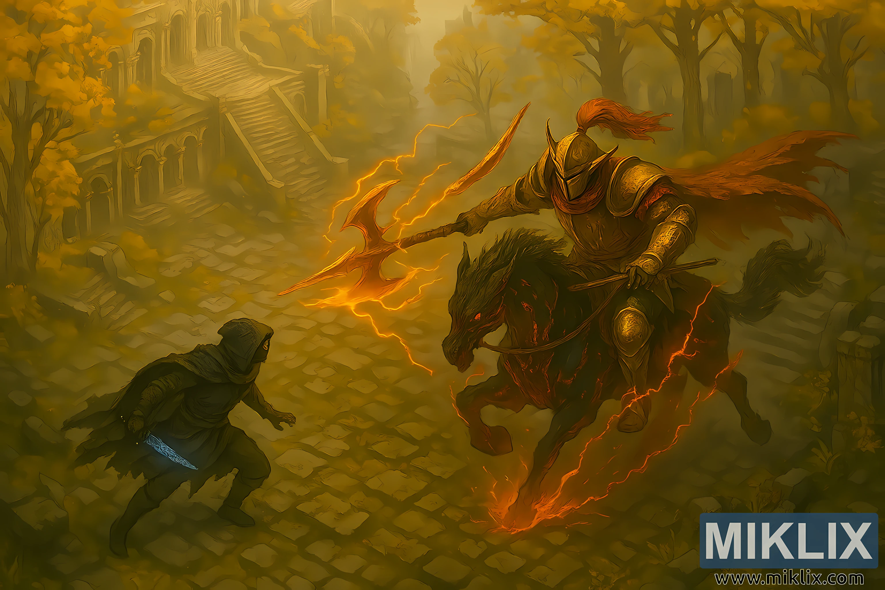 הסביבה עשירה בפרטים: אדמת האבן המרוצפת סדוקה ומכוסה בענפי עשב וטחב, בעוד שרידי פאתי הבירה מתנשאים ברקע. גרמי מדרגות גדולים, קשתות שחוקות ועמודים מתנשאים ממסגרים את הסצנה, מוסתרים חלקית על ידי עצים זהובי-עלים. שמש אחר הצהריים המאוחרת מסתננת מבעד לעלווה, מטיל אור חם ומפוזר על פני שדה הקרב ויוצרת צללים דרמטיים.