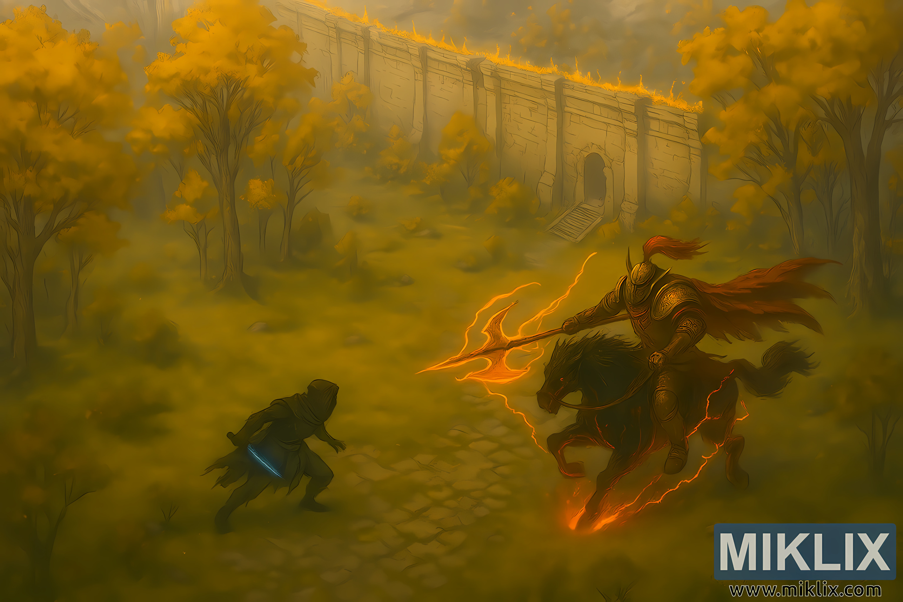 ציור דיגיטלי בסגנון אנימה ברזולוציה גבוהה, בסגנון נוף, מציג מבט דרמטי מלמעלה של קרב בין ה"טארנישד" לזקיף העצים הדרקוני ב"אלדן רינג". הסצנה מתרחשת בקרחת יער פתוחה, מוקפת בעצים נשירים גבוהים עם עלווה סתווית זהובה. השטח הוא שילוב של שבילי אבן מרוצפים סדוקים, טלאים מכוסי עשב וסבך פזור, המעורר אווירה פראית ופראית ממש מעבר לגבולות העיר.