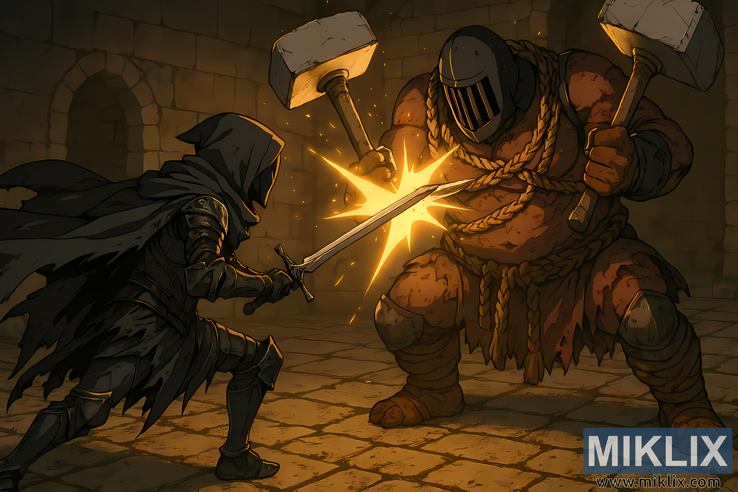 איור בסגנון אנימה ברזולוציה גבוהה של שריון Tarnished in Black Knife נלחם בדו-קרב של שומר הקברים בעזרת פטישים כפולים בקבר הצדדי של אוריזה של אלדן רינג, במבט מזווית איזומטרית.