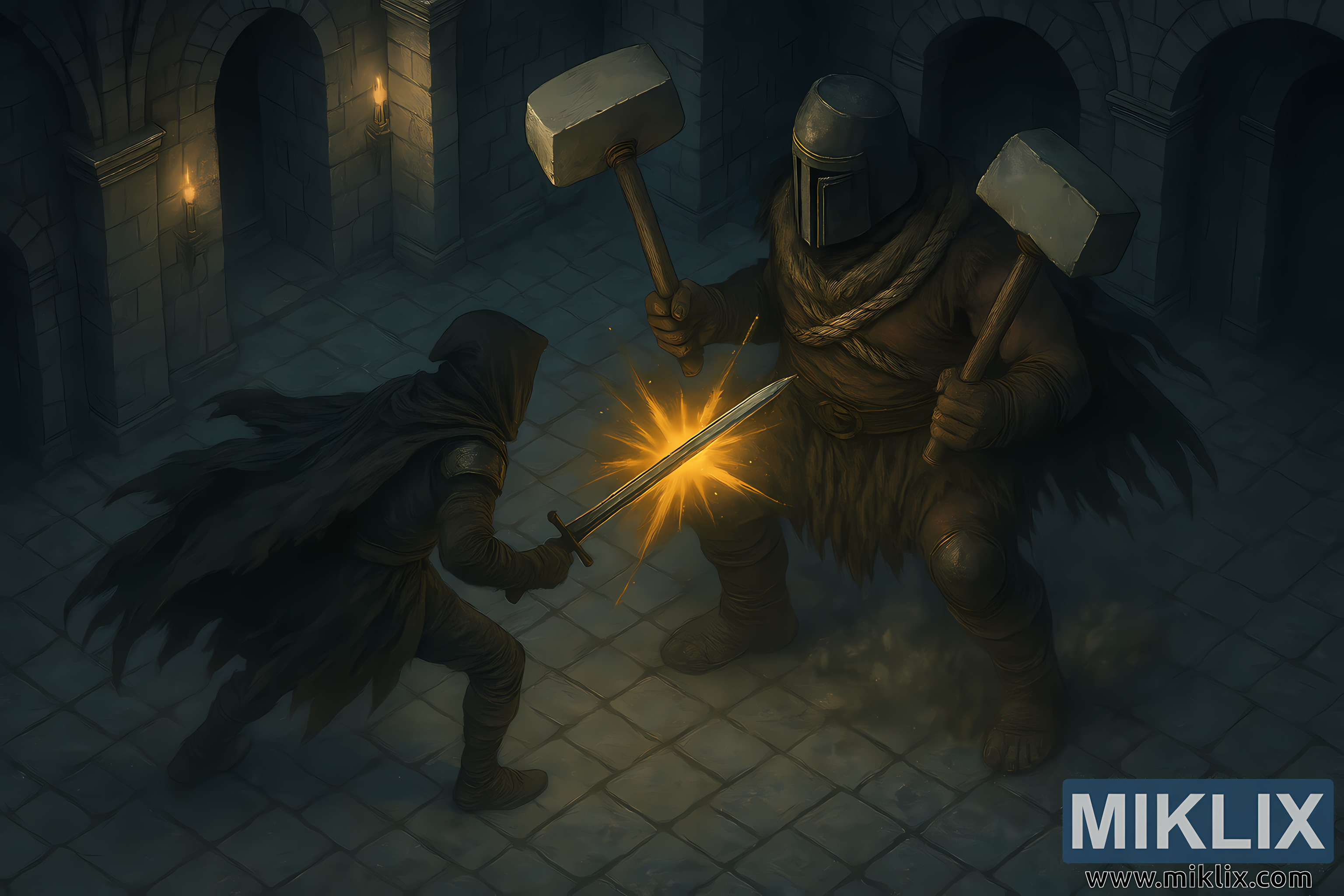 מוקד התמונה הוא ההתנגשות בין החרב הזוהרת לפטיש, שם ניצוצות מתפרצים ואור משתקף מהשריון והאבן שמסביב. התאורה מלנכולית ואווירתית, כאשר הזוהר החם של כלי הנשק והלפידים מנוגד לצבעי האפור-כחול הדומיננטיים. הסגנון הציורי מדגיש ריאליזם באנטומיה, במרקם ובעומק הסביבתי, תוך שמירה על האנרגיה הדרמטית של מפגש פנטסטי. ארכיטקטורת הרקע - פתחי דלתות מקושתים, עמודים ופמוטי לפידים - מוסיפה קנה מידה וסוחף, ומחזקת את האווירה העתיקה והמדכאת של הקבר. תמונה זו אידיאלית לקטלוג, לעיון חינוכי או לשימוש פרסומי בסביבות אמנות פנטזיה ומשחקים.