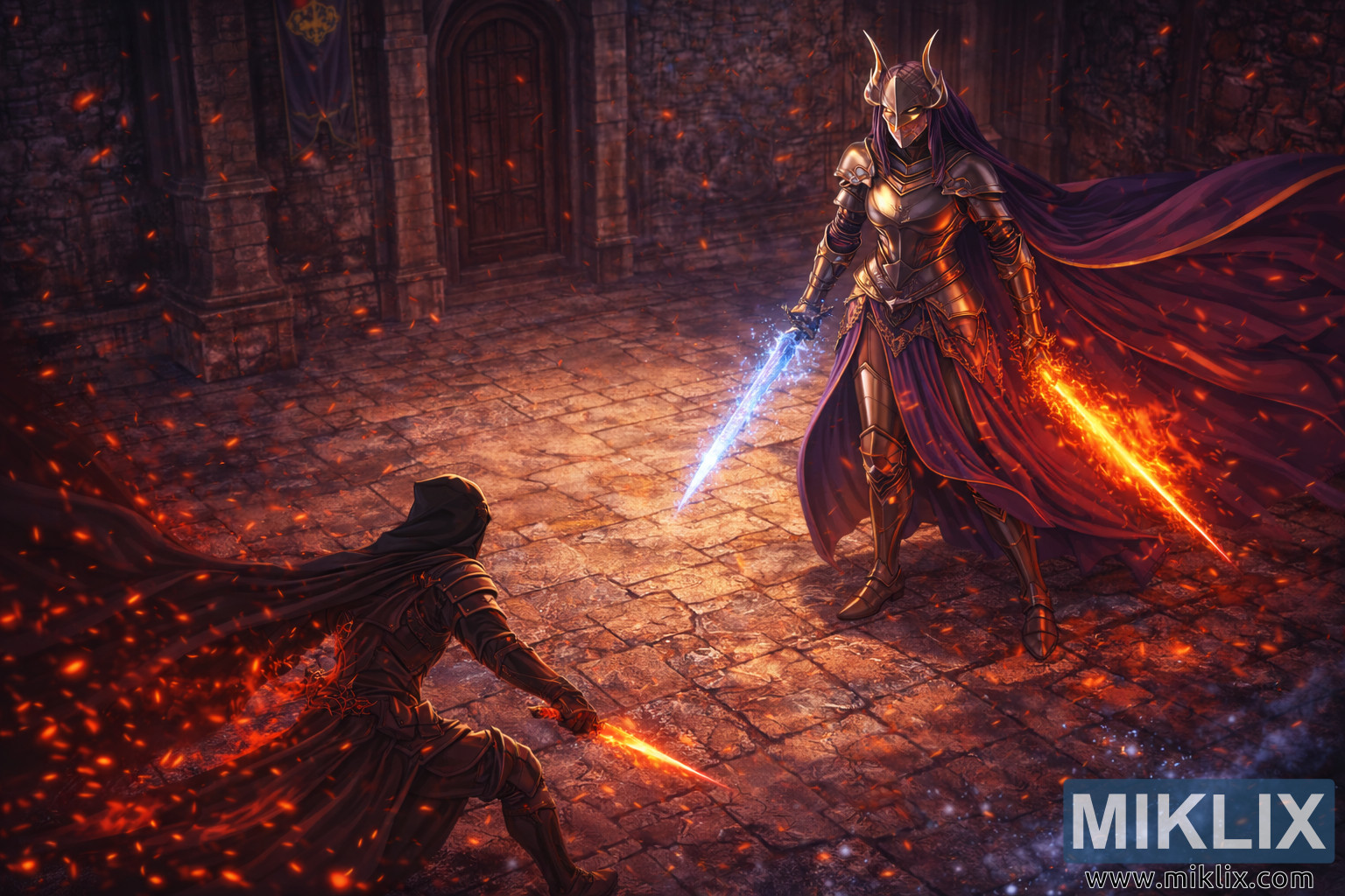 בפינה הימנית העליונה שולטת רלנה, אביר הירח התאום, שנראית גבוהה ומרשימה משמעותית. שריונה הכסוף-זהוב נוצץ בתאורה המעורבת, חרוט במוטיבים ירחיים הרומזים על כוחה השמימי. גלימה סגולה כהה זורמת מאחוריה בקשת רחבה, מגדילה ויזואלית את נוכחותה וממלאת את התמונה בצבע מלכותי. בידה הימנית היא אוחזת בחרב בוערת של להבה טהורה, שובלה הלוהט מתפתל כמו דגל באוויר. בידה השמאלית היא אוחזת בחרב כפור המקרינה אור כחול גבישי, ומפילה גרגירי קרח נוצצים הנסחפים על פני החצר.