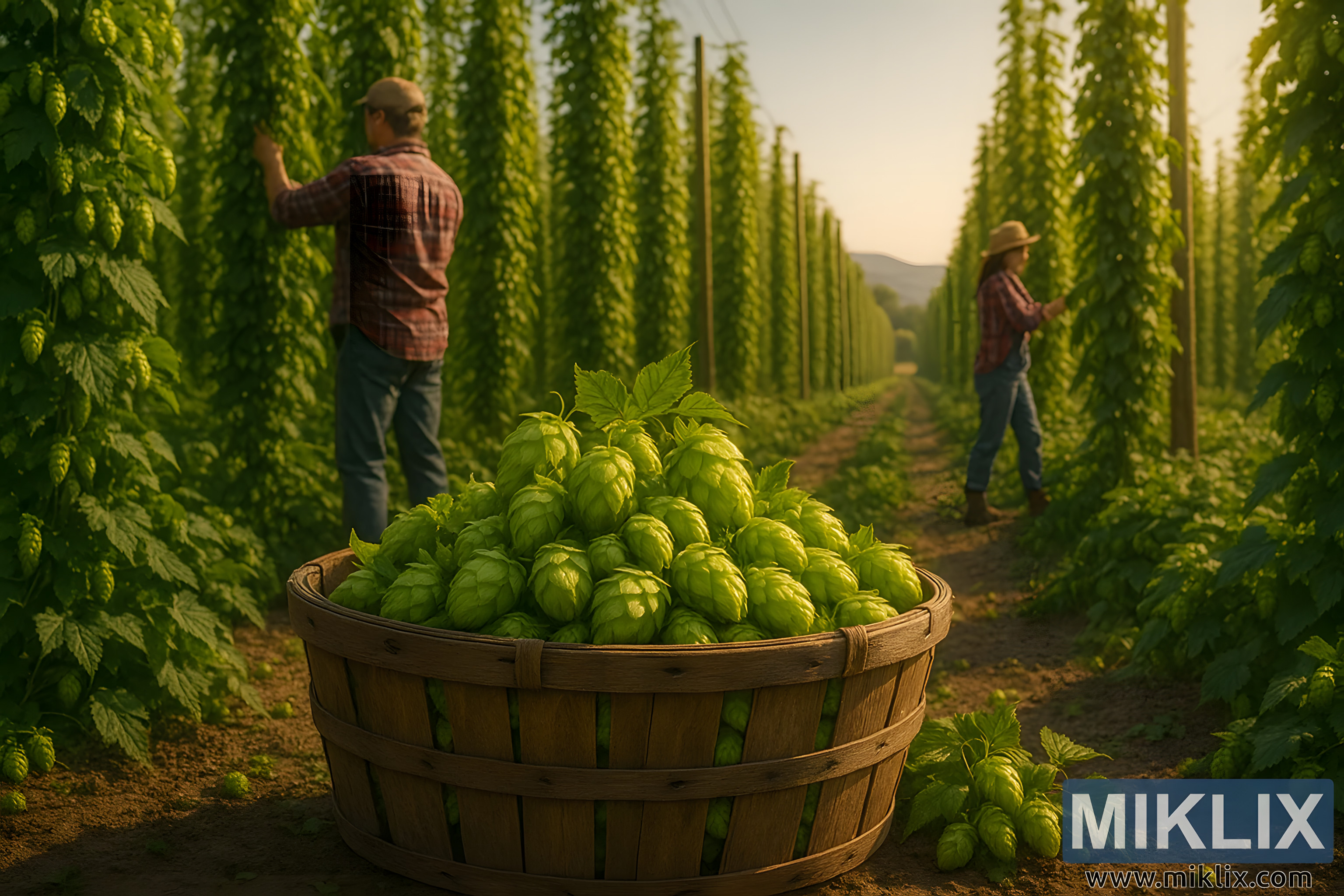 העובדים נעים בשיטתיות בין השורות, חולצותיהם המשובצות ובגדי הג'ינס שלהם מתרככים על ידי הגוונים החמים של השמש השוקעת. תנועותיהם זהירות ומכוונות, ידיים בוחרות כל גביע בקלות מיומנת, ומוודאות שרק הבשלים ביותר יילקחו. למרות שהמשימה חוזרת על עצמה, ישנה יראת כבוד שלא נאמרה בתנוחתם, הבנה שכל כשות שהם אוספים תמלא מאוחר יותר תפקיד חיוני בעיצוב הטעמים והארומות של הבירה שנהנים ממנה הרבה מעבר לשדות אלה. נוכחותם מוסיפה אנושיות למרחב החווה, ומבססת את גדולת הטבע בקצב הצנוע של עבודת כפיים. שילוב זה של מאמץ אנושי ושפע חקלאי משקף את הקשר העמוק בין המגדל למרכיב, מערכת יחסים הבנויה על אמון, סבלנות וכבוד למסורת.