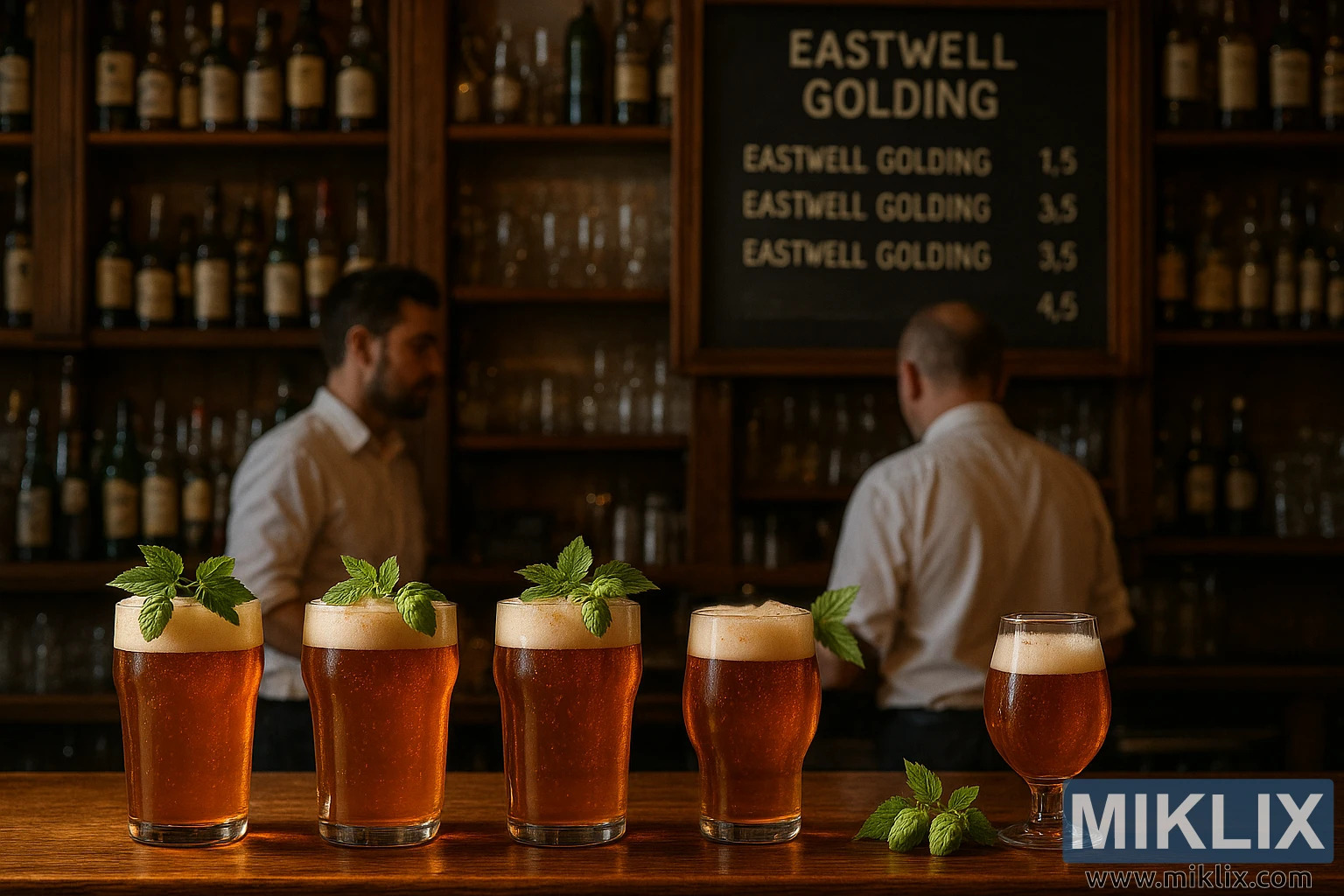 התמונה מתארת את האווירה המזמינה של פאב מסורתי, הלכודה בגוונים חמים וזהובים המדגישים נוחות וחברותיות. הקומפוזיציה מתמקדת סביב בר עץ מלוטש, שפני השטח החלקים שלו משקפים את זוהר התאורה העדינה. על הדלפק, מספר כוסות של בירה בצבע ענבר מוצגות באופן בולט, כל אחת מעוטרת בראש קצף מקציף. מה שמייחד את הבירות הללו הוא עיטור ענפי כשות טריים של איסטוול גולדינג המונחים בעדינות על גבי הכוסות, כאשר עליהם הירוקים העזים מספקים ניגוד בולט לגווני הענבר של הנוזל. כשות זו, הידועה בארומה הייחודית שלה ובמורשת הבישול שלה, מוסיפה תזכורת ויזואלית וסמלית לאומנות הכרוכה בייצור המשקאות.
