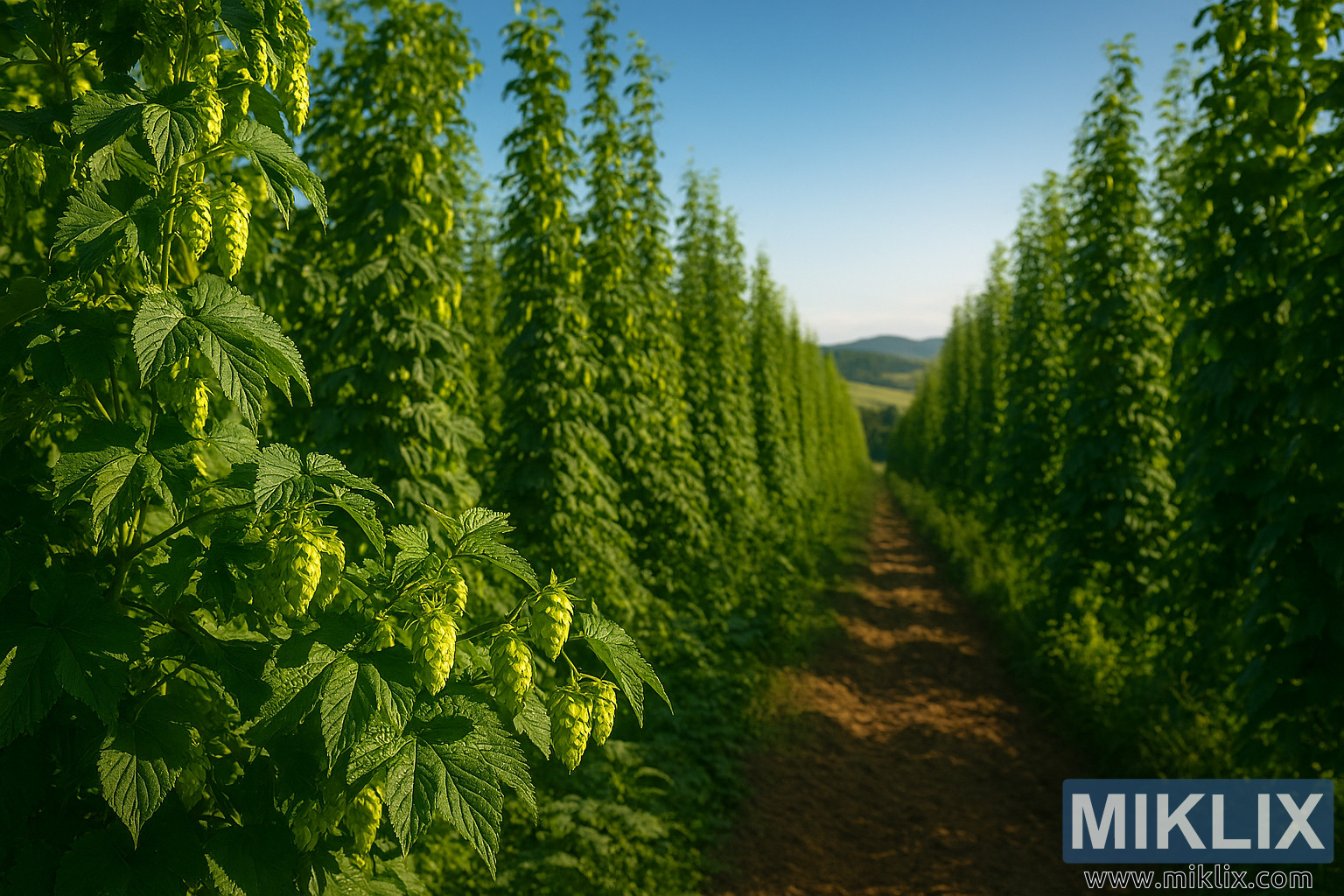 תצלום נוף ברזולוציה גבוהה זה לוכד את היופי השליו ואת הדיוק החקלאי של שדה כשות אלסאסר בשעת הזהב. התמונה, שצולמה בעדשה רחבת זווית, מציגה נוף רחב של ענפי כשות גבוהים של חומלוס לופולוס המסודרים בשורות מקבילות המשתרעות למרחק. הפרספקטיבה נמוכה מעט, מדגישה את גובהם המתנשא של הצמחים ומושכת את עינו של הצופה לאורך שביל עפר מרכזי המוביל אל גבעות מתגלגלות בעדינות ברקע.