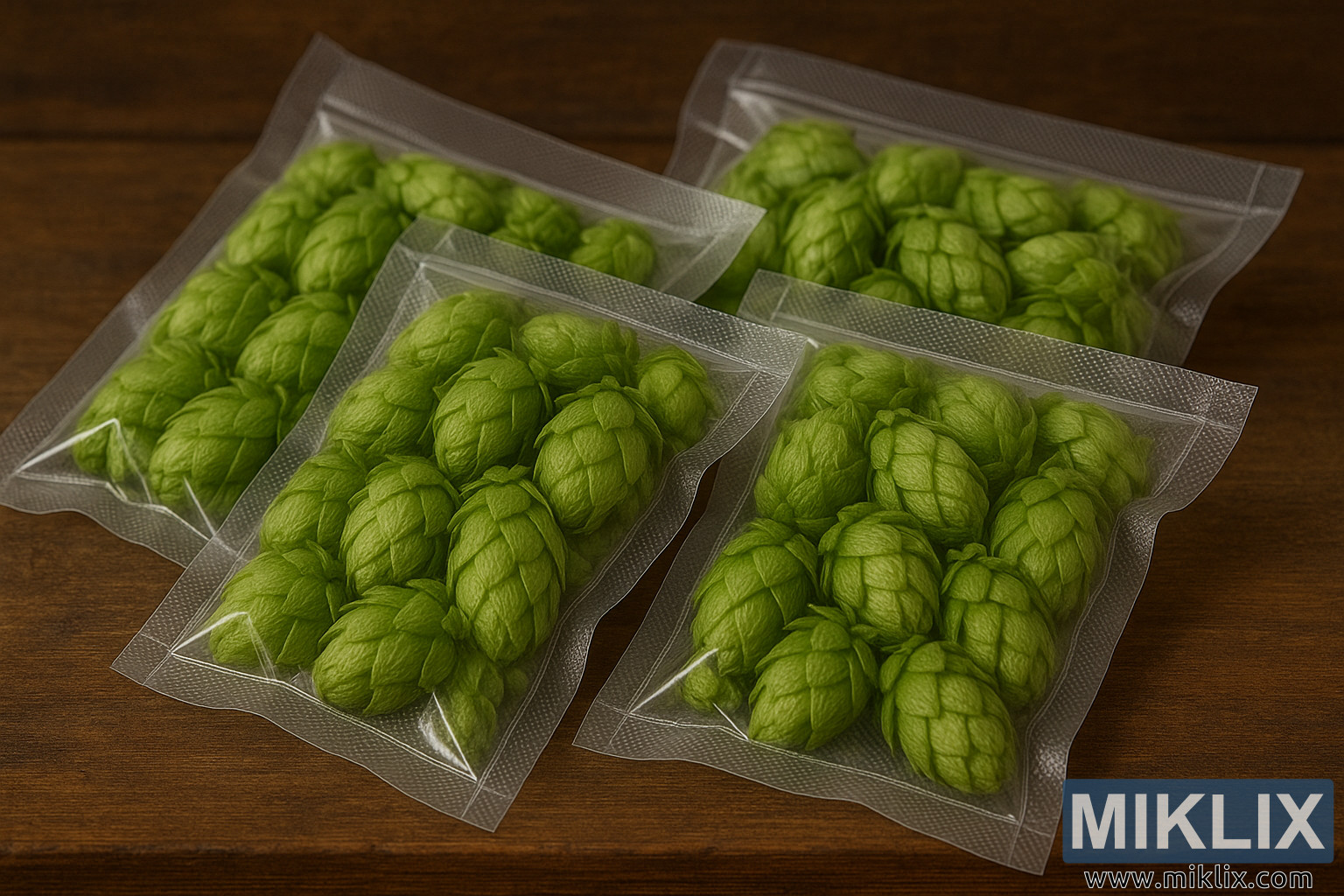 על משטח עץ עשיר בגרגירים, המקרין חמימות וקסם כפרי, ארבע שקיות אטומות בוואקום של גביעי כשות טריים מסודרות בדיוק ובזהירות. העץ שמתחתן, המסומן בפגמים עדינים ובמרקם טבעי, קובע את הטון לסצנה שמרגישה גם אומנותית וגם מבוססת על מסורת. כל שקית עשויה מפלסטיק שקוף עם מרקם דוגמת יהלום ייחודי, עיצוב שלא רק מחזק את האיטום אלא גם מוסיף איכות מישושית לקומפוזיציה החזותית. דרך החומר השקוף, גביעי הכשות נראים לעין לחלוטין - ירוקים עזים, מלאים, ומרובדים בצורה מורכבת עם חפים המתפתלים ומתקפלים כמו עלים מיניאטוריים. המבנה שלהם אורגני ללא ספק, כל גביש הוא פלא זעיר של הנדסת הטבע, עמוס בשמנים ובחומצות המעניקים לבירה את מרירותה וארומה הייחודית שלה.