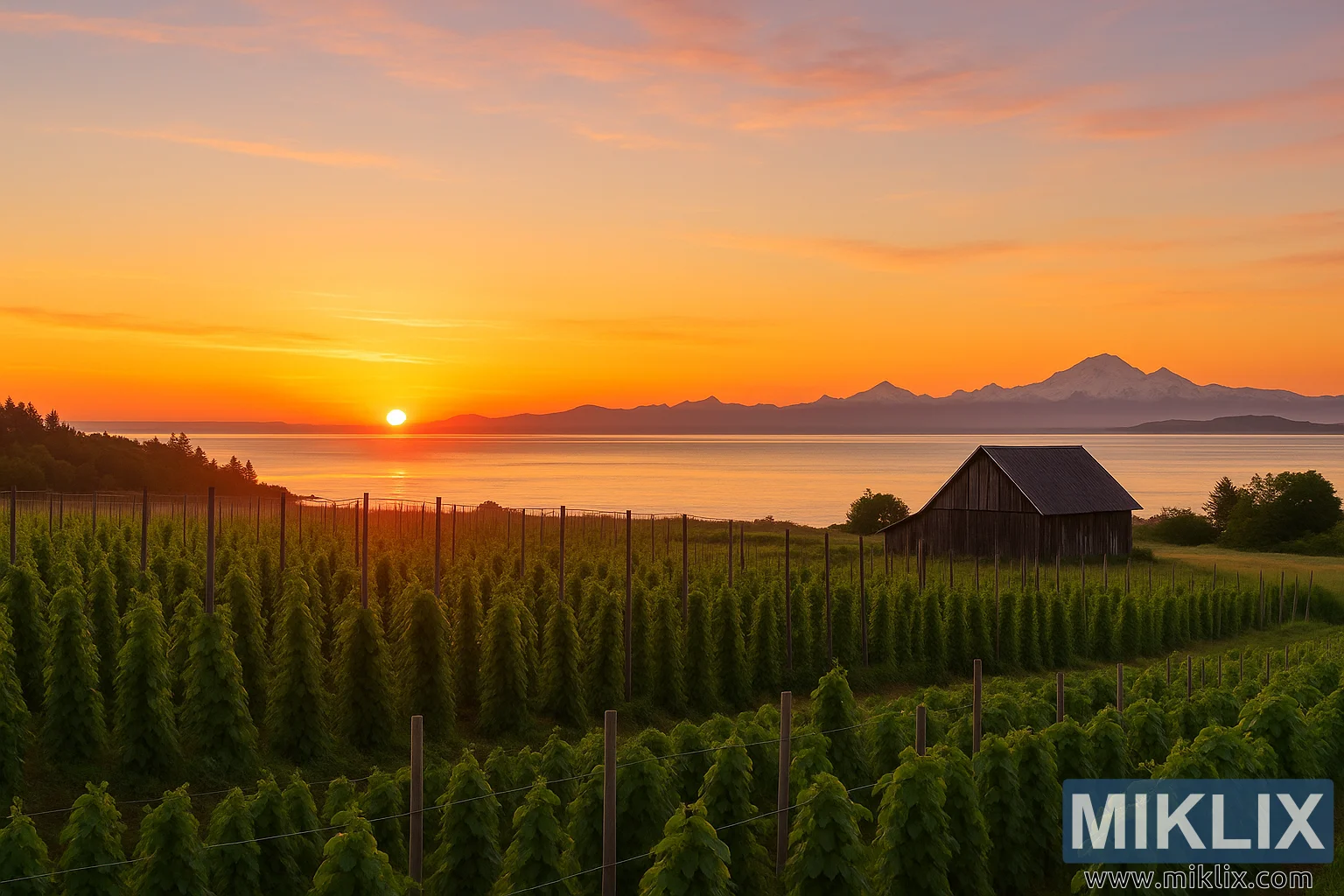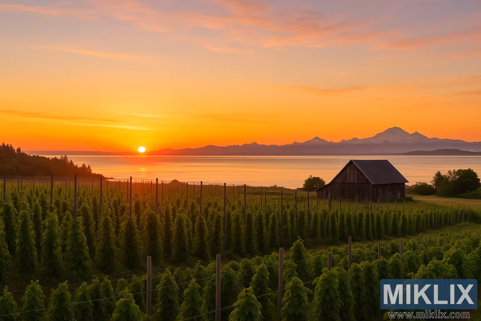 מעבר לאסם, קו החוף נפרש בעיקולים עדינים, פס של מים כסופים לוכד את השתקפותה הלוהטת של הזריחה. שמי צפון מערב האוקיינוס השקט עצמם בוערים - כתומים בוהקים וזהב מותך ליד האופק מתערבבים עם ורודים וסגולים רכים יותר גבוה יותר, בעוד פיזור של עננים דקים זוהר כמו משיכות מכחול עדינות. במרחק, רכס הרים מלכותי מתנשא, פסגותיהם המשוננות והמושלגות צבועות בזוהר הוורוד של השחר. משחק הגומלין בין שמיים חמים לגווני הרים קרירים יוצר תחושה מרשימה של עומק ושלווה, ומשלים את החזון הזה של הרמוניה, שפע והדר טבעי.