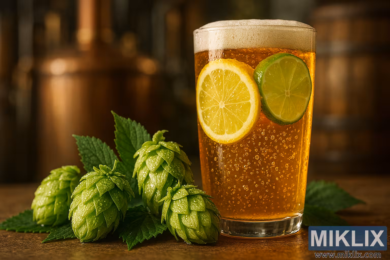 ממש מאחורי הכשות, כוס בירה זהובה צלולה ניצבת מעט מחוץ למרכז. הבירה זוהרת בגוון ענברי חם, ובועות עדינות עולות בעדינות אל פני השטח ויוצרות ראש קצף עדין. בתוך הכוס, פרוסות הדרים בהירות - לימון אחד וליים אחד - צפות בחיוניות שקופה. פרוסת הלימון, הממוקמת קדימה, מציגה בשר צהוב עשיר וקליפה בהירה, בעוד שפרוסת הליים שמאחוריה מוסיפה ניגוד ירוק פריך. טיפות זעירות של עיבוי נאחזות בכוס, ומעצימות את תחושת הרעננות והריאליזם.