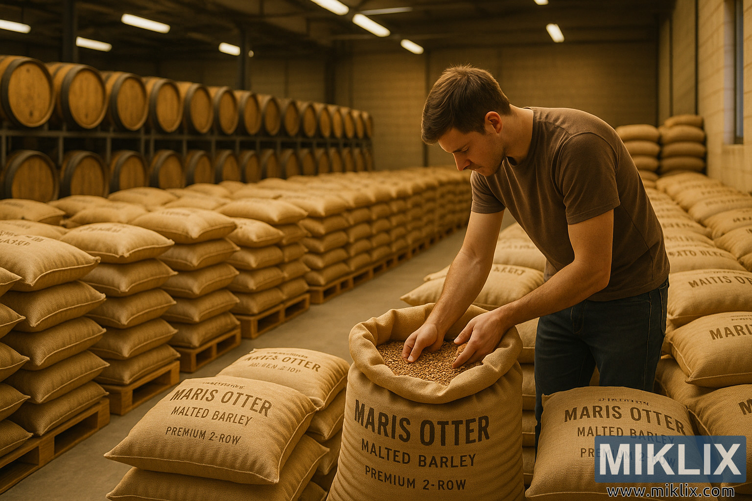 בחזית התמונה, פועל עומד עסוק ברגע של בדיקה שקטה, תנוחתו קשובה ומכוונת. הוא רוכן מעל שק פתוח גדול שכותרתו "MARIS OTTER MALTED BARLEY PREMIUM 2-ROW", מסנן בעדינות את הגרגרים בידיים מיומנות. השעורה המולתת זוהרת תחת האור, גרגיריה זהובים-חומים שמנמנים ואחידים, מקרינים ברק עדין שמעיד על טריותם ואיכותם. זה לא מבט אגבי - זהו טקס של אחריות, מחווה המשקפת את מערכת היחסים האינטימית של המבשל עם מרכיביו. נוכחותו של העובד מוסיפה ממד אנושי לסצנה, ומזכירה לצופה שמאחורי כל בירה נהדרת עומדים הטיפול והמומחיות של אלו המטפלים בחומרי הגלם שלה.