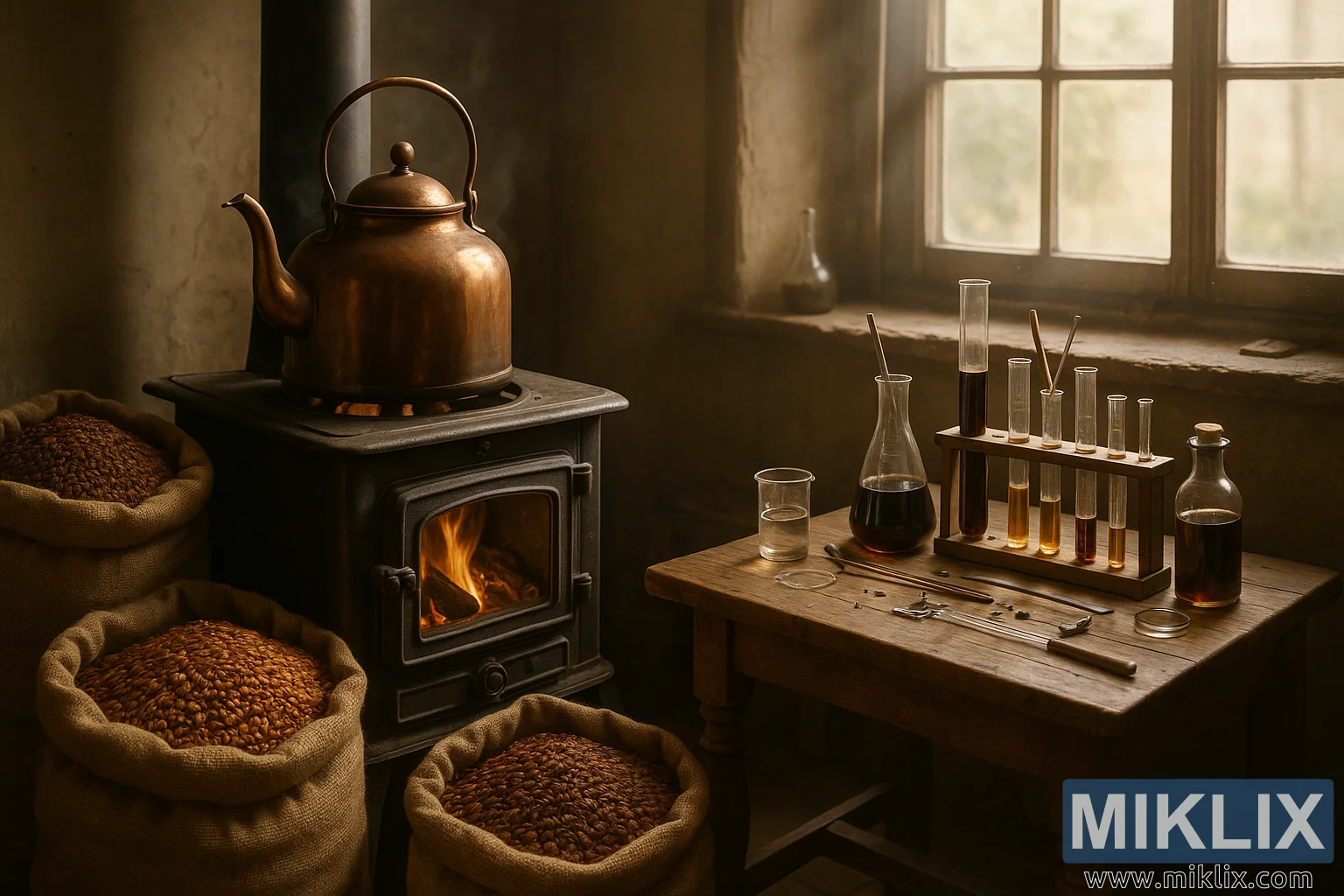בחדר שמרגיש תלוי בין קסם כפרי לסקרנות מדעית, התמונה לוכדת מערכת בישול שהיא מחווה למסורת כמו גם חגיגה של ניסויים. בלב הסצנה ניצב תנור עצים וינטג', גוף הברזל היצוק שלו מקרין חמימות ותכלית. מעליו מונח קומקום נחושת גדול, פני השטח שלו זוהרים בפטינה רכה המדברת על שנים של שימוש ואינספור מנות חליטה. בפנים, נוזל עשיר בגוון ענברי מבעבע בעדינות, משחרר אדים ארומטיים המתפתלים כלפי מעלה ומתערבבים עם האור הזהוב הזורם מבעד לחלון רב-חלונות. האש בתוך התנור מתפצפצת בשקט, מטילה צללים מרצדים על פני החדר ומעניקה לחלל תחושה של נוחות והמשכיות.