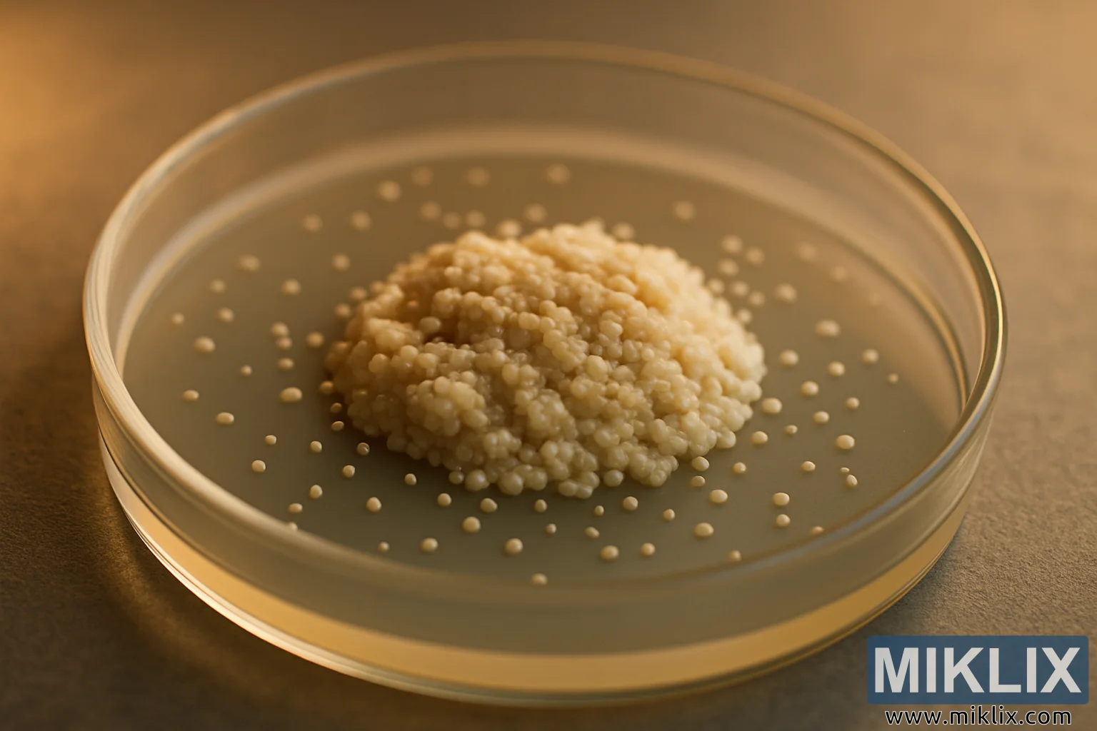 ברקע, משטח המעבדה דוהה לטשטוש רך וקטיפתי, צבעו החום-אפור הנייטרלי מבטיח שהוא אינו מתחרה על תשומת הלב עם המנה. רקע מטושטש זה מספק גם ניגודיות חזותית וגם עומק, מה שהופך את תרבית השמרים הממוקדת בחדות לבלוט כנושא שאין לטעות בו.