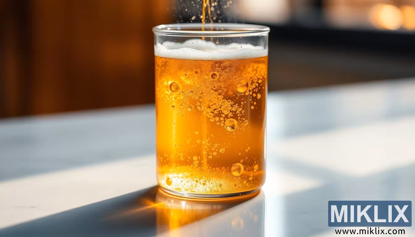 כוס זכוכית מכילה תמיסת שמרים מקציפה, המודגשת על ידי תאורה חמה, המדגימה דיוק וביצועים לבישול בירה.