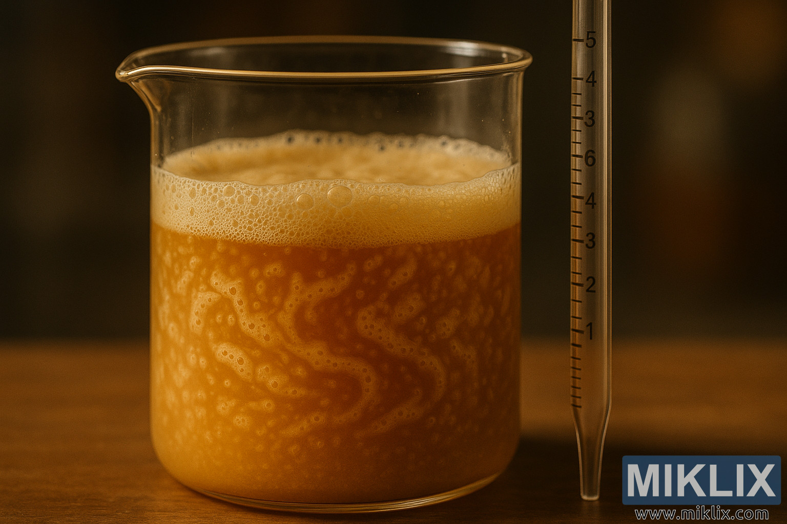 שמרים צפופים ומסתחררים בכוס מעבדה זוהרת עם פיפטה, המדגישים מדידות תסיסה מרכזיות.